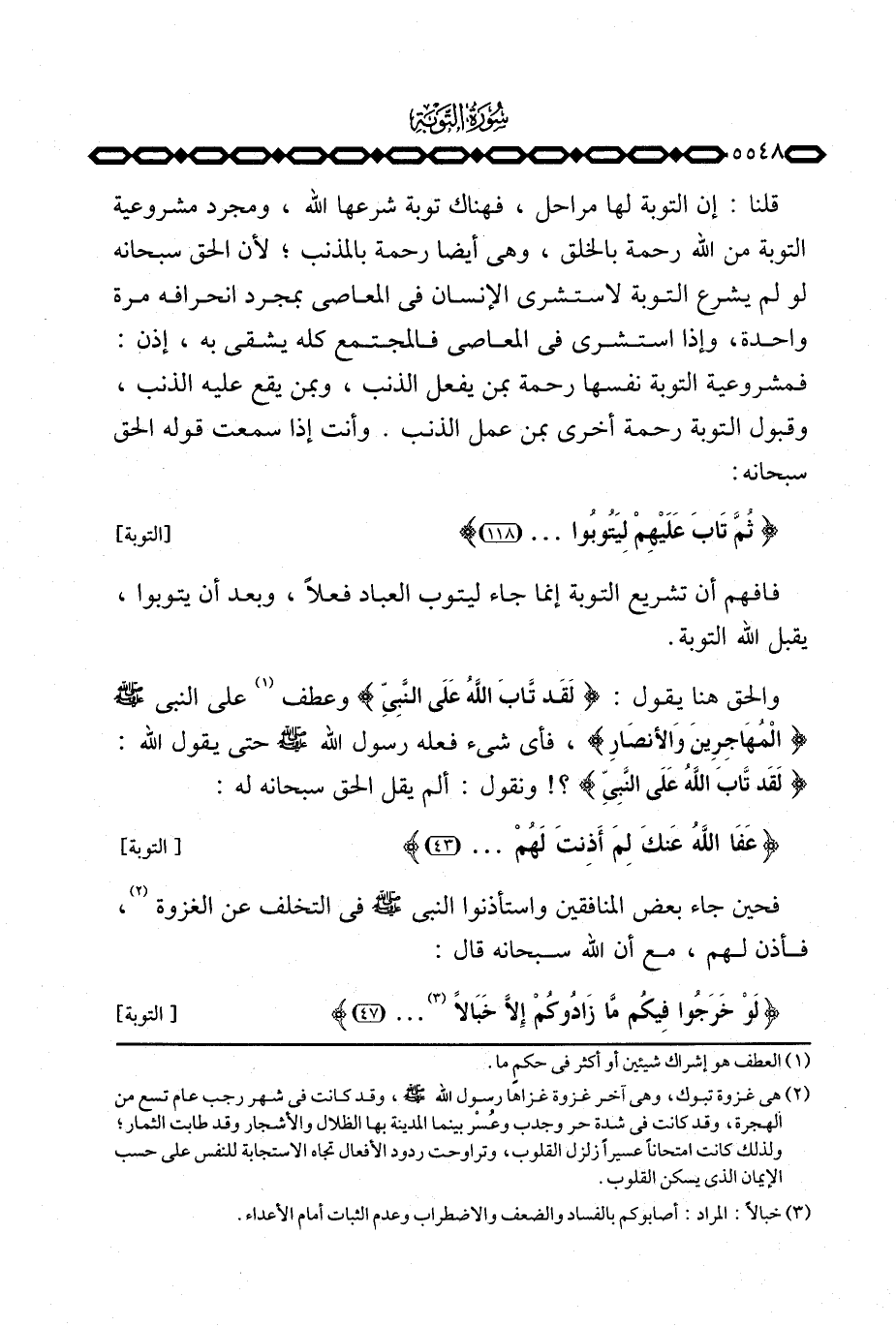 والحق هنا يقول: {لَقَدْ تَابَ الله على النبي} وعطف على النبي صَلَّى اللَّهُ عَلَيْهِ وَسَلَّم َ {المهاجرين والأنصار} ، فأي شيء فعله رسول الله صَلَّى اللَّهُ عَلَيْهِ وَسَلَّم َ حتى يقول الله: {لَقَدْ تَابَ الله على النبي} ؟! ونقول ألم يقل الحق سبحانه له: {عَفَا الله عَنكَ لِمَ أَذِنتَ لَهُمْ ... } [التوبة: 43]