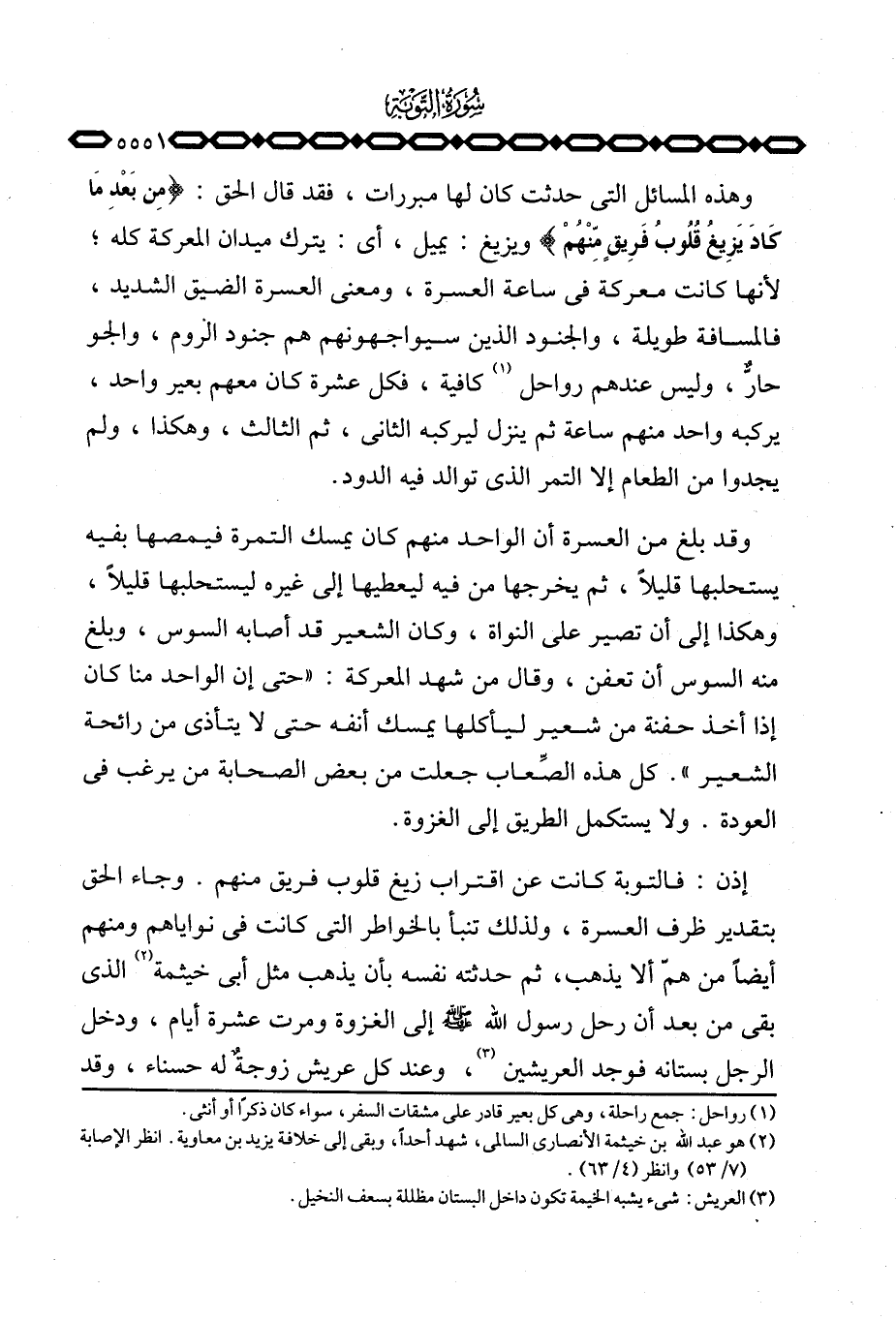 وهذه المسائل التي حدثت كان لها مبررات، فقد قال الحق: {مِن بَعْدِ مَا كَادَ يَزِيغُ قُلُوبُ فَرِيقٍ مِّنْهُمْ} ويزيغ: يميل، أي: يترك ميدان المعركة كله؛ لأنها كانت معركة في ساعة العسرة، ومعنى العسرة الضيق الشديد، فالمسافة طويلة، والجنود الذين سيواجهونهم هم جنود الروم، والجو حارٌّ، وليس عندهم رواحل كافية، فكل عشرة كان معهم بعير واحد، يركبه واحد منهم ساعة ثم ينزل ليركبه الثاني، ثم الثالث، وهكذا، ولم يجدوا من الطعام إلا التمر الذي توالد فيه الدود.
