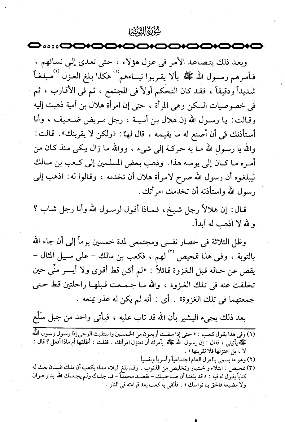 وبعد ذلك يتصاعد الأمر في عزل هؤلاء، حتى تعدى إلى نسائهم، فأمرهم رسول الله صَلَّى اللَّهُ عَلَيْهِ وَسَلَّم َ بألا يقربوا نساءهم هكذا بلغ العزل مبلغاً شديداً ودقيقاً، فقد كان التحكم أولاً في المجتمع، ثم في الأقارب، ثم في خصوصيات السكن وهي المرأة، حتى إن امرأة هلال بن أمية ذهبت إليه وقالت: يا رسول الله إن هلال بن أمية، رجل مريض ضعيف، وأنا أستأذنك في أن أصنع له ما يقيمه، قال لها: «ولكن لا يقربنك» . قالت والله يا رسول الله ما به حركة إلى شيء، ووالله ما زال يبكي منذ كان من أمره ما كان إلى يومه هذا. وذهب بعض المسلمين إلى كعب بن مالك ليبلغوه أن رسول الله صرح لامرأة هلال أن تخدمه، وقالوا له: اذهب إلى رسول الله واستأذنه أن تخدمك امرأتك.