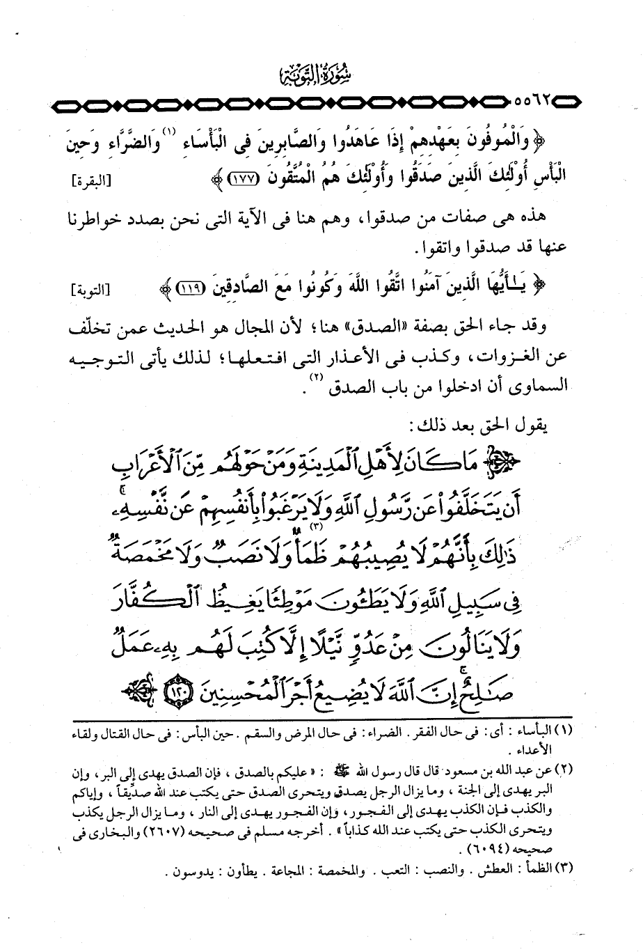 {والموفون بِعَهْدِهِمْ إِذَا عَاهَدُواْ والصابرين فِي البأسآء والضراء وَحِينَ البأس أولئك الذين صَدَقُواْ وأولئك هُمُ المتقون} [البقرة: 177]