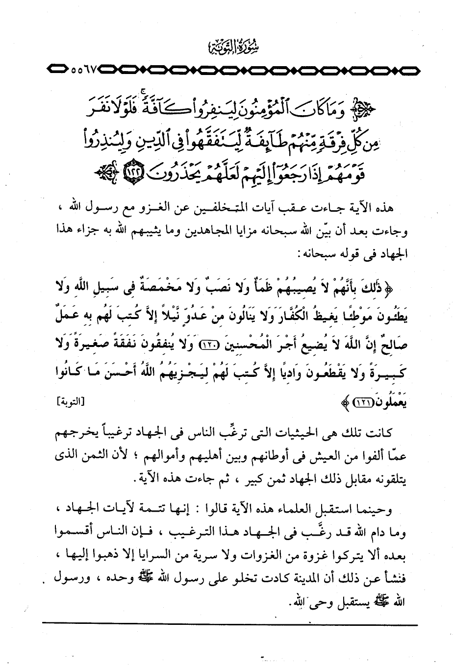وحينما استقبل العلماء هذه الآية قالوا: إنها تتمة لآيات الجهاد، وما دام الله قد رغَّب في الجهاد هذا الترغيب، فإن الناس أقسموا بعده ألا يتركوا غزوة من الغزوات ولا سرية من السرايا إلا ذهبوا إليها، فنشأ عن ذلك أن المدينة كادت تخلو على رسول الله صَلَّى اللَّهُ عَلَيْهِ وَسَلَّم َ وحده، ورسول الله صَلَّى اللَّهُ عَلَيْهِ وَسَلَّم َ يسقبل وحي الله.