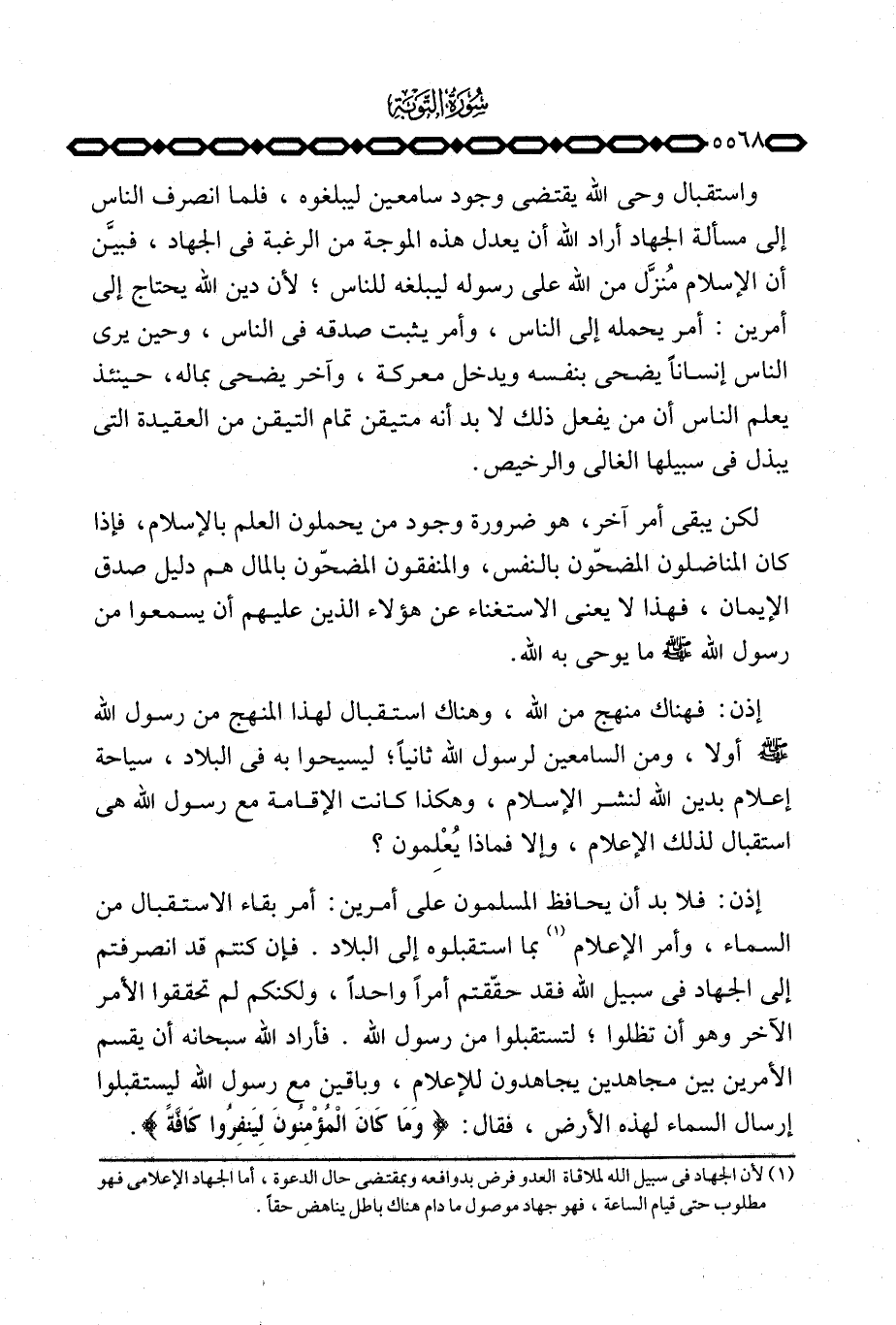 واستقبال وحي الله يقتضي وجود سامعين ليبلغوه، فلما انصرف الناس إلى مسألة الجهاد أراد الله أن يعدل هذه الموجة من الرغبة في الجهاد، فبيّن أن الإسلام مُنزَّل من الله على رسوله ليبلغه للناس؛ لأن دين الله يحتاج إلى أمرين: أمر يحمله إلى الناس، وأمر يثبت صدقه في الناس، وحين يرى الناس إنساناً يضحى بنفسه ويدخل معركة، وآخر يضحي بماله، حينئذ يعلم الناس أن من يفعل ذلك لا بد أنه متيقن تمام التيقن من العقيدة التي يبذل في سبيلها الغالي والرخيص.