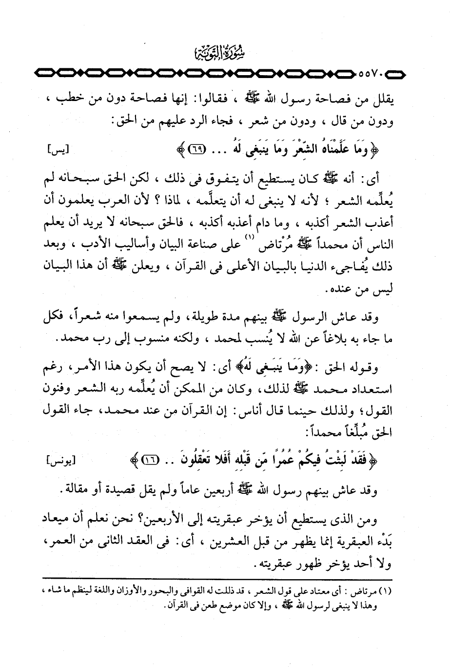 وقد عاش الرسول صَلَّى اللَّهُ عَلَيْهِ وَسَلَّم َ بينهم مدة طويلة، ولم يسمعوا منه شعراً، فكل ما جاء به بلاغاً عن الله لا يُنسب لمحمد، ولكنه منسوب إلى رب محمد.