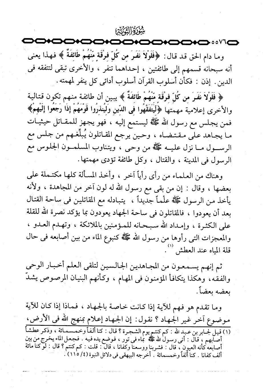 {فَلَوْلاَ نَفَرَ مِن كُلِّ فِرْقَةٍ مِّنْهُمْ طَآئِفَةٌ} يبين أن طائفة منهم تكون قتالية والأخرى إعلامية مهمتها {لِّيَتَفَقَّهُواْ فِي الدين وَلِيُنذِرُواْ قَوْمَهُمْ إِذَا رجعوا إِلَيْهِمْ} فمن يجلس مع رسول الله صَلَّى اللَّهُ عَلَيْهِ وَسَلَّم َ ليستمع إليه، فهو يجهز للمقاتل حيثيات ما يجاهد على مقتضاه، وحين يرجع المقاتلون يُبلِّغهم من جلس مع الرسول ما نزل عليه صَلَّى اللَّهُ عَلَيْهِ وَسَلَّم َ من وحي، ويتناوب المسلمون الجلوس مع الرسول في المدينة، والقتال، وكل طائفة تؤدي مهمتها.