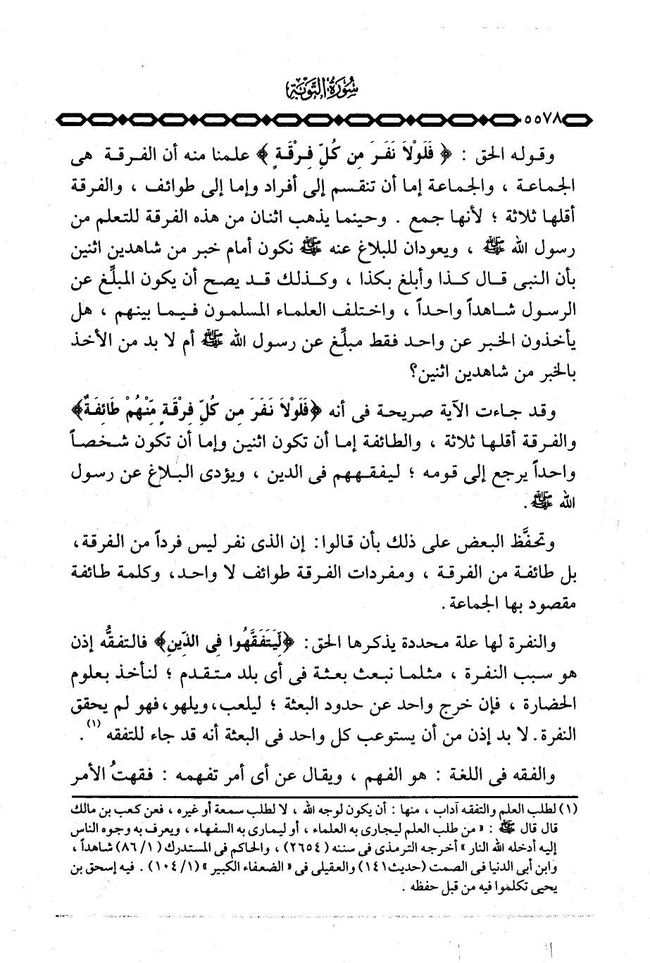 وقوله الحق: {فَلَوْلاَ نَفَرَ مِن كُلِّ فِرْقَةٍ} علمنا منه أن الفرقة هي الجماعة، والجماعة إما أن تنقسم إلى أفراد وإما إلى طوائف، والفرقة أقلها ثلاثة؛ لأنها جمع. وحينما يذهب اثنان من هذه الفرقة للتعلم من رسول الله صَلَّى اللَّهُ عَلَيْهِ وَسَلَّم َ، ويعودان للبلاغ عنه صَلَّى اللَّهُ عَلَيْهِ وَسَلَّم َ نكون أمام خبر من شاهدين اثنين بأن النبي قال كذا وأبلغ بكذا، وكذلك قد يصح أن يكون المبلِّغ عن الرسول شاهداً واحداً، واختلف العلماء المسلمون فيما بينهم، هل يأخذون الخبر عن واحد فقط مبلِّغ عن رسول الله صَلَّى اللَّهُ عَلَيْهِ وَسَلَّم َ أم لا بد من الأخذ بالخبر من شاهدين اثنين؟