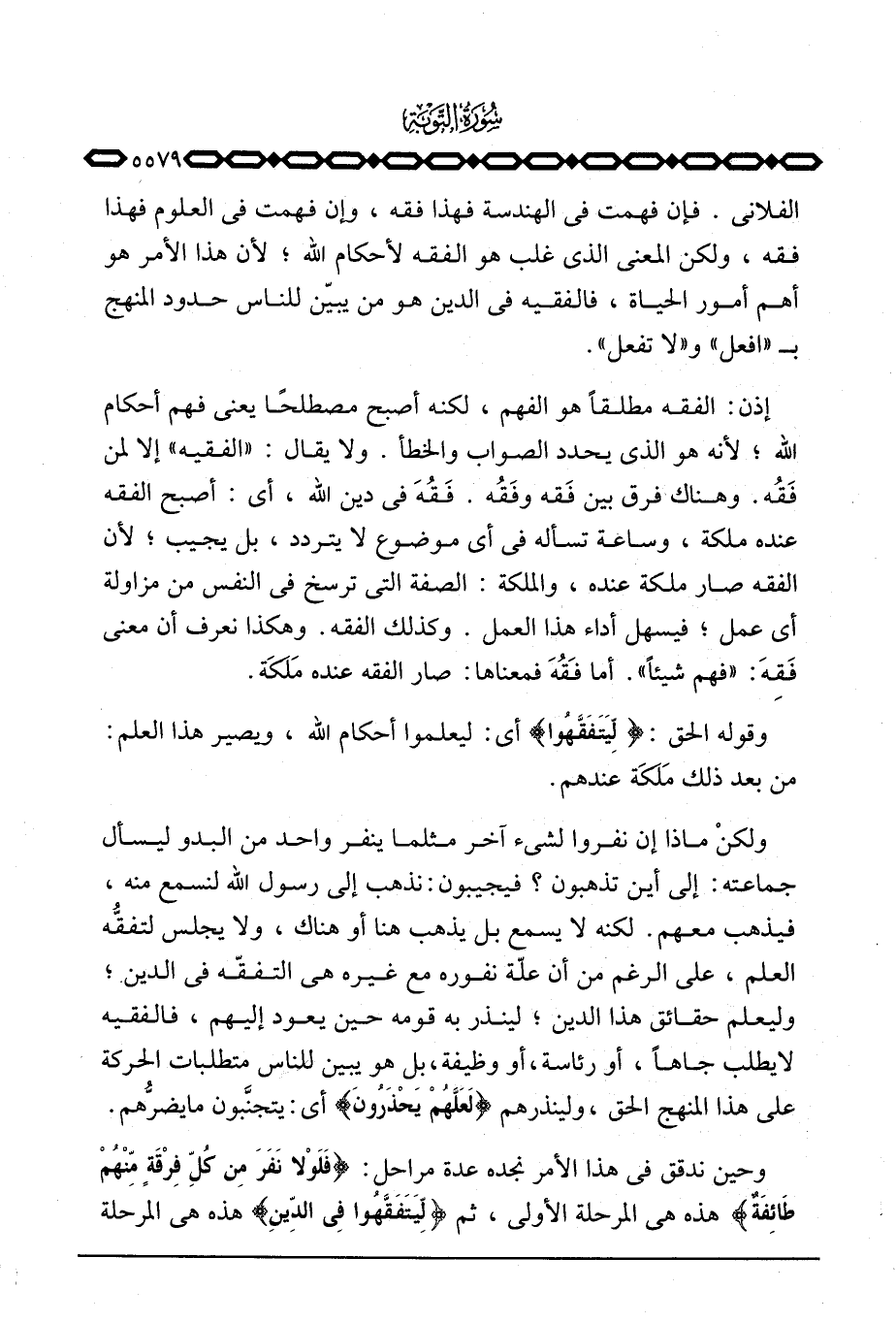 وحين ندقق في هذا الأمر نجده عدة مراحل: {فَلَوْلاَ نَفَرَ مِن كُلِّ فِرْقَةٍ مِّنْهُمْ طَآئِفَةٌ} هذه هي المرحلة الأولى، ثم {لِّيَتَفَقَّهُواْ فِي الدين} هذه هي المرحلة
