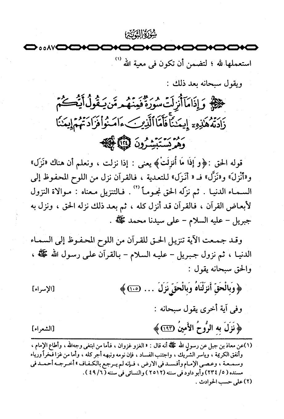 قوله الحق: {وَإِذَا مَآ أُنزِلَتْ} يعني: إذا نزلت، ونعلم أن هناك «نَزَل» و «أَنْزلَ» و «نَزَّل» ف «أنَزَل» للتعدية، فالقرآن نزل من اللوح المحفوظ إلى السماء الدنيا. ثم نزّله الحق نجوماً. فالتنزيل معناه: موالاة النزول لأبعاض القرآن، فالقرآن قد أنزل كله، ثم بعد ذلك نزله الحق، ونزل به جبريل - عليه السلام - على سيدنا محمد صَلَّى اللَّهُ عَلَيْهِ وَسَلَّم َ.