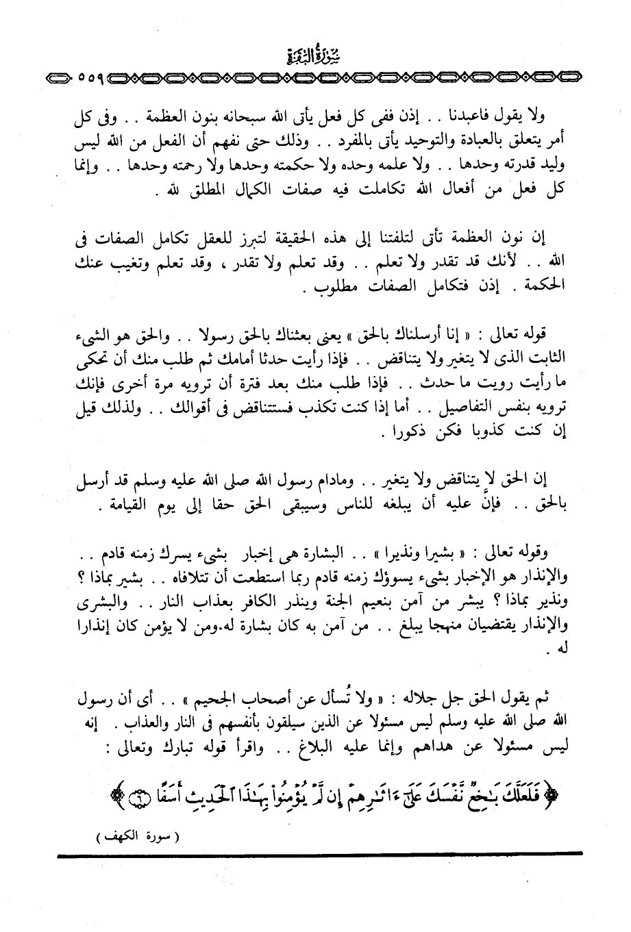 ثم يقول الحق جل جلاله: {وَلاَ تُسْأَلُ عَنْ أَصْحَابِ الجحيم} . . أي أن رسول الله صَلَّى اللَّهُ عَلَيْهِ وَسَلَّم َ ليس مسئولا عن الذين سيلقون بأنفسهم في النار والعذاب. إنه ليس مسئولا عن هداهم وإنما عليه البلاغ. . واقرأ قوله تبارك وتعالى: {فَلَعَلَّكَ بَاخِعٌ نَّفْسَكَ على آثَارِهِمْ إِن لَّمْ يُؤْمِنُواْ بهذا الحديث أَسَفاً} [الكهف: 6]