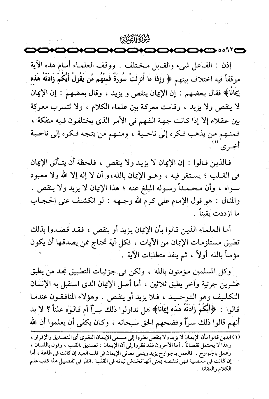فالذين قالوا: إن الإيمان لا يزيد ولا ينقص، فلحظة أن يتألق الإيمان في القلب؛ يستقر فيه، وهو الإيمان بالله، وأن لا إله إلا الله ولا معبود سواه، وأن محمداً رسوله المبلغ عنه؛ هذا الإيمان لا يزيد ولا ينقص. والمثال: هو قول الإمام على كرم الله وجهه: لو انكشف عني الحجاب ما ازدادت يقيناً.