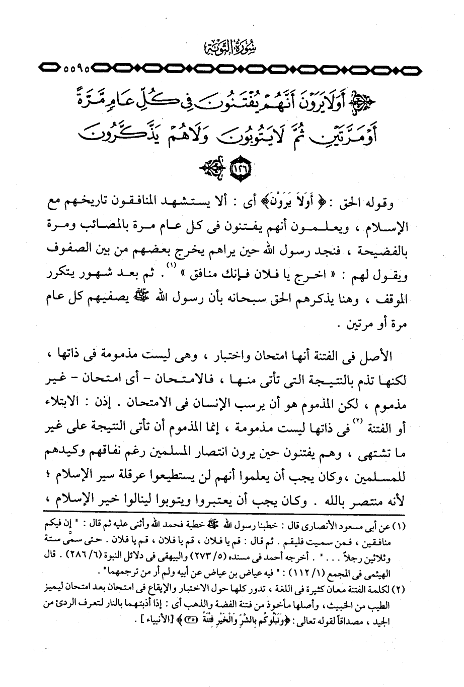 الأصل في الفتنة أنها امتحان واختبار، وهي ليست مذمومة في ذاتها، لكنها تذم بالنتيجة التي تأتي منها، فالامتحان - أي امتحان - غير مذموم، لكن المذموم هو أن يرسب الإنسان في الامتحان. إذن: الابتلاء أو الفتنة في ذاتها ليست مذمومة، إنما المذموم أن تأتي النتيجة على غير ما تشتهي، وهم يفتنون حين يرون انتصار المسلمين وغم نفاقهم وكيدهم للمسلمين، وكان يجب أن يعلموا أنهم لن يستطيعوا عرقلة سير الإسلام؛ لأنه منتصر بالله. وكان يجب أن يعتبروا ويتوبوا لينالوا خير الإسلام،