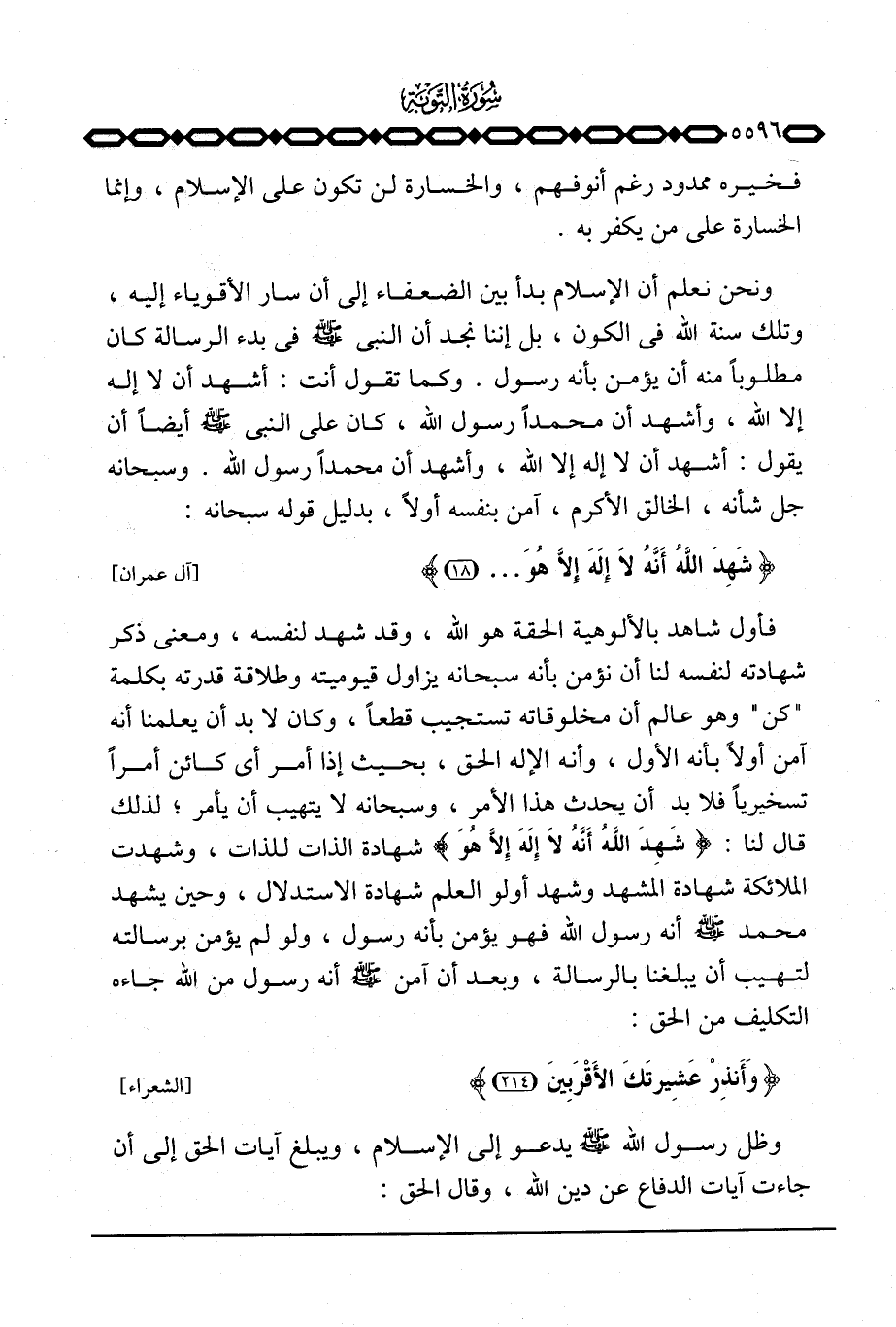 فأول شاهد بالألوهية الحقة هو الله، وقد شهد لنفسه، ومعنى ذكر شهادته لنفسه لنا أن نؤمن بأنه سبحانه يزاول قيوميته وطلاقة قدرته بكلمة «كن» وهو عالم أن مخلوقاته تستجيب قطعاً، وكان لا بد أن يعلمنا أنه آمن أولاً بأنه الأول، وأنه الإله الحق، بحيث إذا أمر أي كائن أمراً تسخيرياً فلا بد أن يحدث هذا الأمر، وسبحانه لا يتهيب أن يأمر؛ لذلك قال لنا: {شَهِدَ الله أَنَّهُ لاَ إله إِلاَّ هُوَ} شهادة الذات للذات، وشهدت الملائكة شهادة المشهد وشهد أولو العلم شهادة الاستدلال، وحين يشهد محمد صَلَّى اللَّهُ عَلَيْهِ وَسَلَّم َ أنه رسول الله فهو يؤمن بأنه رسول، ولو لم يؤمن برسالته لتهيب أن يبلغنا بالرسالة، وبعد أن آمن صَلَّى اللَّهُ عَلَيْهِ وَسَلَّم َ أنه رسول من الله جاءه التكليف من الحق: {وَأَنذِرْ عَشِيرَتَكَ الأقربين} [الشعراء: 214]