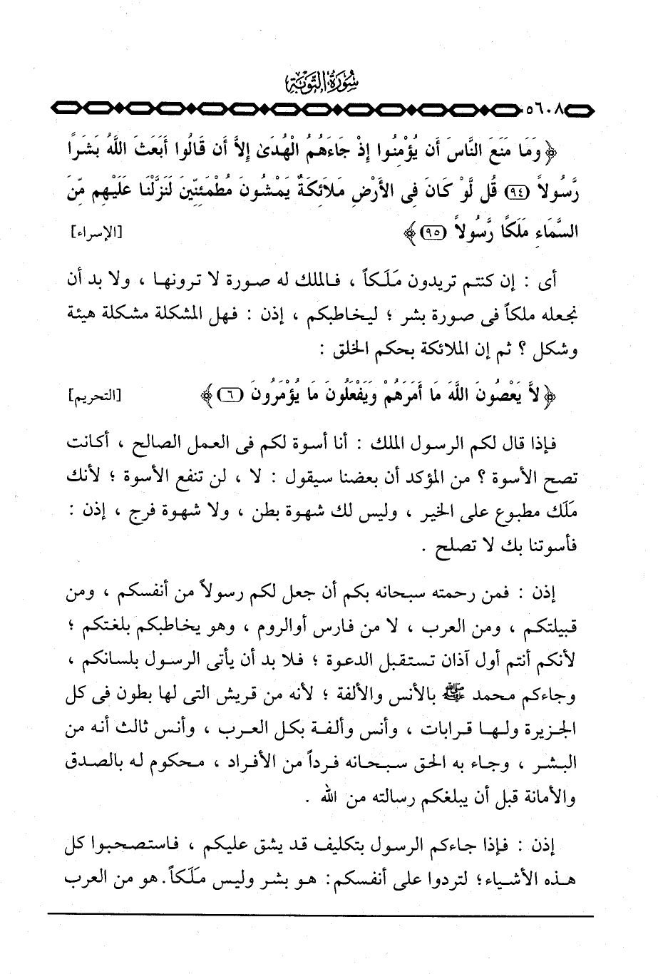 {وَمَا مَنَعَ الناس أَن يؤمنوا إِذْ جَآءَهُمُ الهدى إِلاَّ أَن قالوا أَبَعَثَ الله بَشَراً رَّسُولاً قُل لَوْ كَانَ فِي الأرض ملائكة يَمْشُونَ مُطْمَئِنِّينَ لَنَزَّلْنَا عَلَيْهِم مِّنَ السمآء مَلَكاً رَّسُولاً} [الإسراء: 94 - 95]
