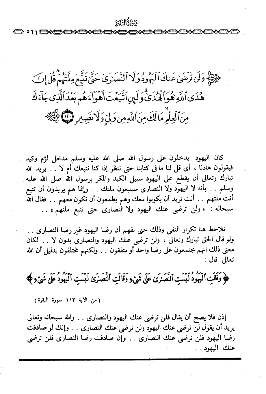 كان اليهود يدخلون على رسول الله صَلَّى اللَّهُ عَلَيْهِ وَسَلَّم َ مدخل لؤم وكيد فيقولون هادنا، أي قل لنا ما في كتابنا حتى ننظر إذا كنا نتبعك أم لا. . يريد الله تبارك وتعالى أن يقطع على اليهود سبيل الكيد والمكر برسول الله صَلَّى اللَّهُ عَلَيْهِ وَسَلَّم َ. . بأنه لا اليهود ولا النصارى سيتبعون ملتك. . وإنما هم يريدون أن تتبع أنت ملتهم. . أنت تريد أن يكونوا معك وهم يطمعون أن تكون معهم. . فقال الله سبحانه: {وَلَنْ ترضى عَنكَ اليهود وَلاَ النصارى حتى تَتَّبِعَ مِلَّتَهُمْ} . .