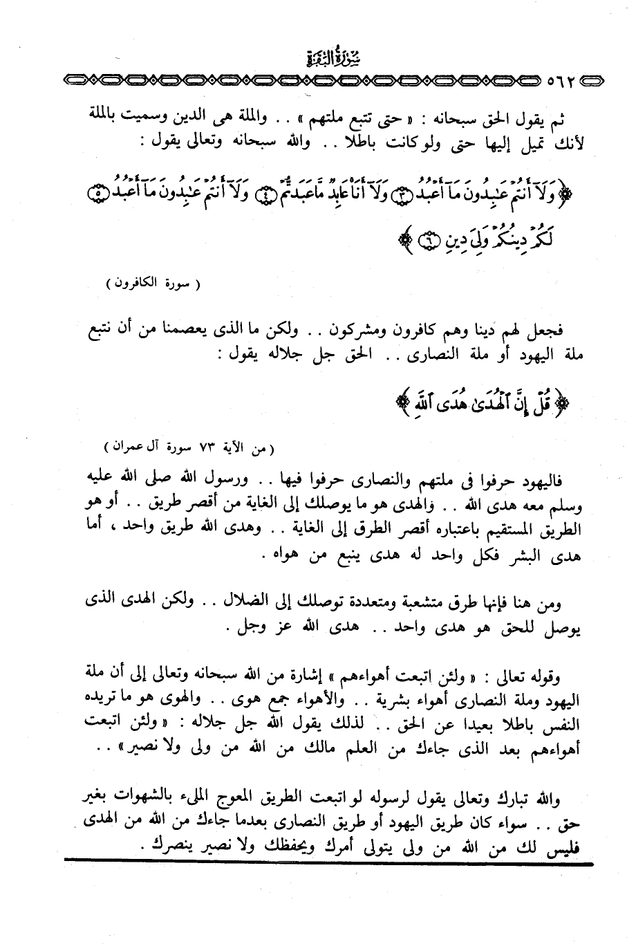 ثم يقول الحق سبحانه: {حتى تَتَّبِعَ مِلَّتَهُمْ} . . والملة هي الدين وسميت بالملة لأنك تميل إليها حتى ولو كانت باطلا. . والله سبحانه وتعالى يقول: {وَلاَ أَنتُمْ عَابِدُونَ مَآ أَعْبُدُ وَلاَ أَنَآ عَابِدٌ مَّا عَبَدتُّمْ وَلاَ أَنتُمْ عَابِدُونَ مَآ أَعْبُدُ لَكُمْ دِينُكُمْ وَلِيَ دِينِ} [الكافرون: 3 - 6]