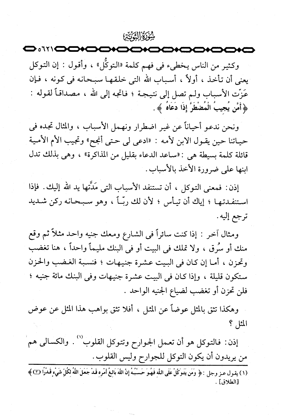 وكثير من الناس يخطئ في فهم كلمة «التوكُّل» ، وأقول: إن التوكل يعني أن تأخذ، أولاً، أسباب الله التي خلقها سبحانه في كونه، فإن عَزّت الأسباب ولم تصل إلى نتيجة؛ فاتجه إلى الله، مصداقاً لقوله: {أَمَّن يُجِيبُ المضطر إِذَا دَعَاهُ} .