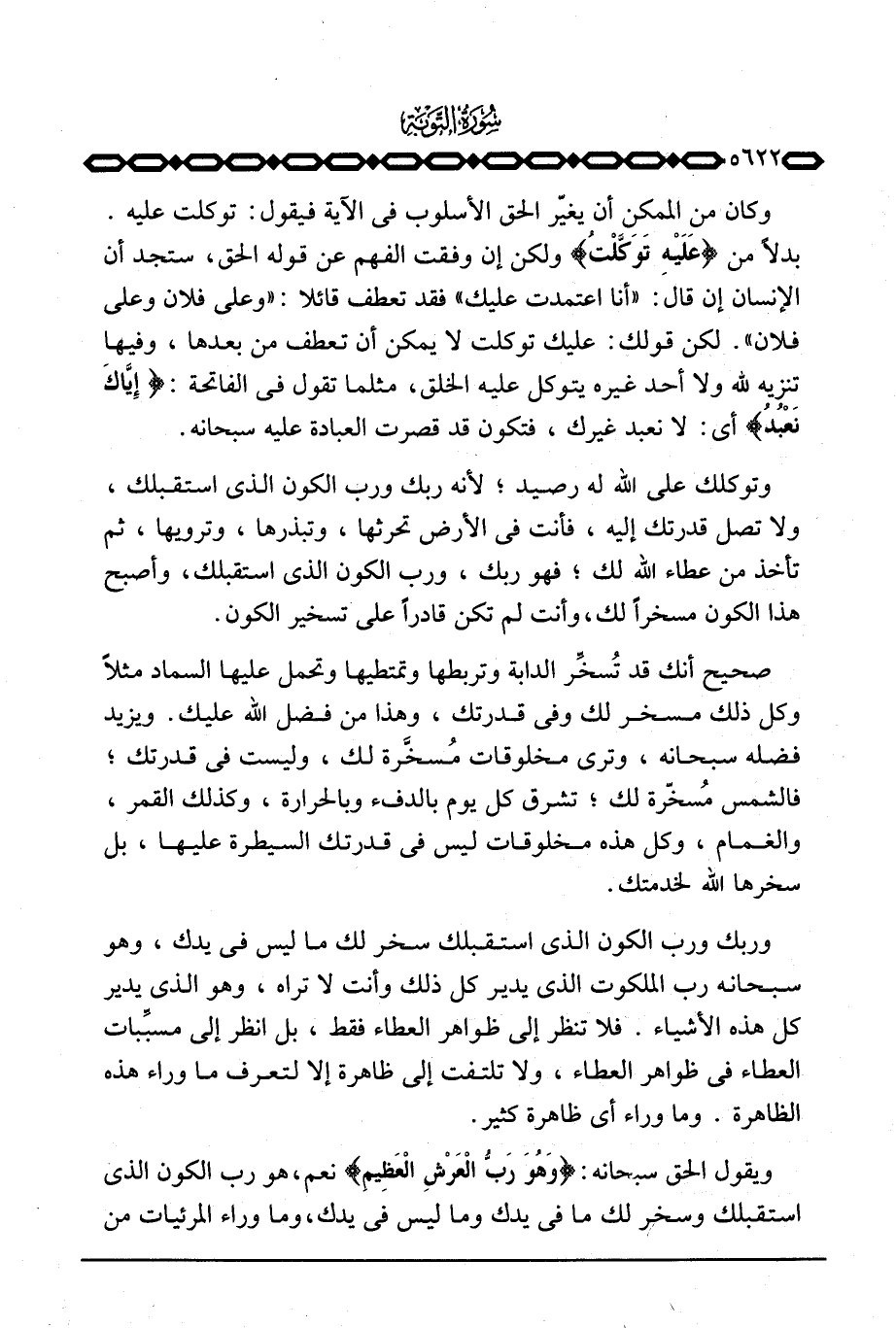 وكان من الممكن أن يغيّر الحق الأسلوب في الآية فيقول: توكلت عليه. بدلاً من {عَلَيْهِ تَوَكَّلْتُ} ولكن إن وفقت الفهم عن قوله الحق، ستجد أن الإنسان إن قال: «أنا اعتمدت عليك» فقد تعطف قائلاً: «وعلى فلان وعلى فلان» . لكن قولك: عليك توكلت لا يمكن أن تعطف من بعدها، وفيها تنزيه لله ولا أحد غيره يتوكل عليه الخلق، مثلما تقول في الفاتحة: {إِيَّاكَ نَعْبُدُ} أي: لا نعبد غيرك، فتكون قد قصرت العبادة عليه سبحانه.