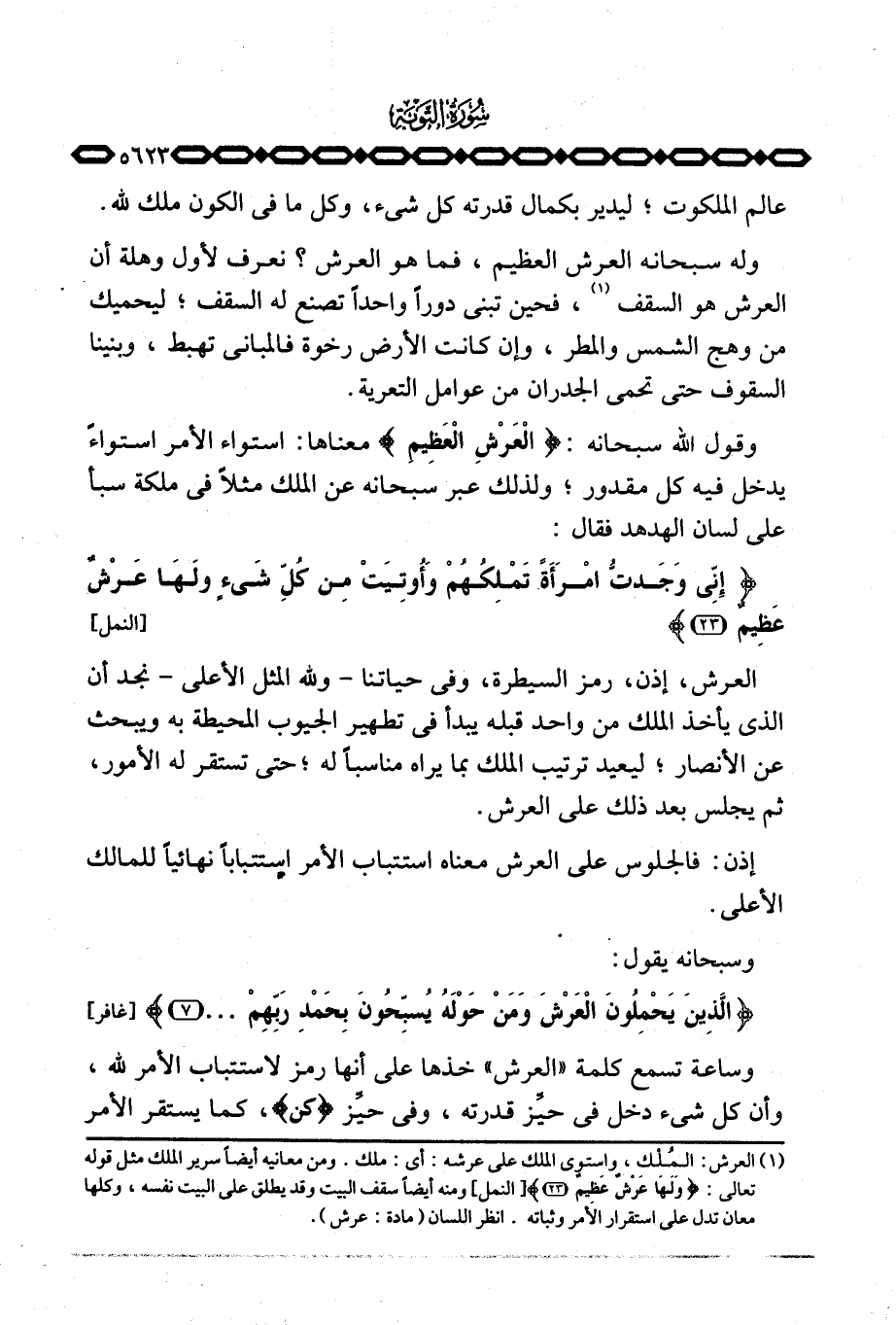 وقول الله سبحانه: {العرش العظيم} معناها: استواء الأمر استواءً يدخل فيه كل مقدور؛ ولذلك عبر سبحانه عن الملك مثلاً في ملكة سبأ على لسان الهدهد فقال: {إِنِّي وَجَدتُّ امرأة تَمْلِكُهُمْ وَأُوتِيَتْ مِن كُلِّ شَيْءٍ وَلَهَا عَرْشٌ عَظِيمٌ} [النمل: 23]