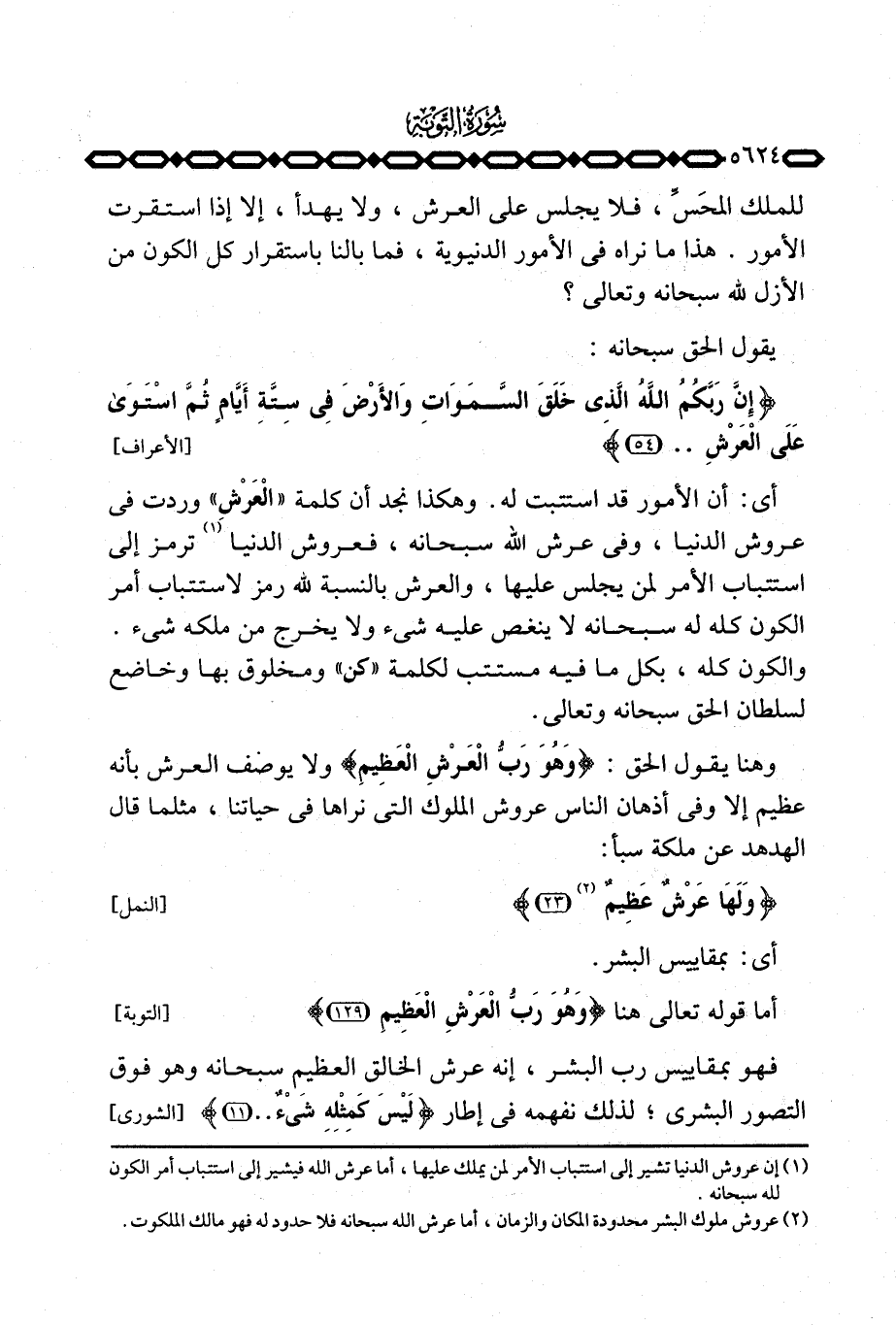 أي: أن الأمور قد استتبت له. وهكذا نجد أن كلمة «الْعَرْشِ» وردت في عروش الدنيا، وفي عرش الله سبحانه، فعروش الدنيا ترمز إلى استتباب الأمر لمن يجلس عليها، والعرش بالنسبة لله رمز للاستتباب أمر الكون كله له سبحانه لا ينغص عليه شيء ولا يخرج من ملكه شيء. والكون كله، بكل ما فيه مستتب لكلمة «كن» ومخلوق بها وخاضع لسلطان الحق سبحانه وتعالى.