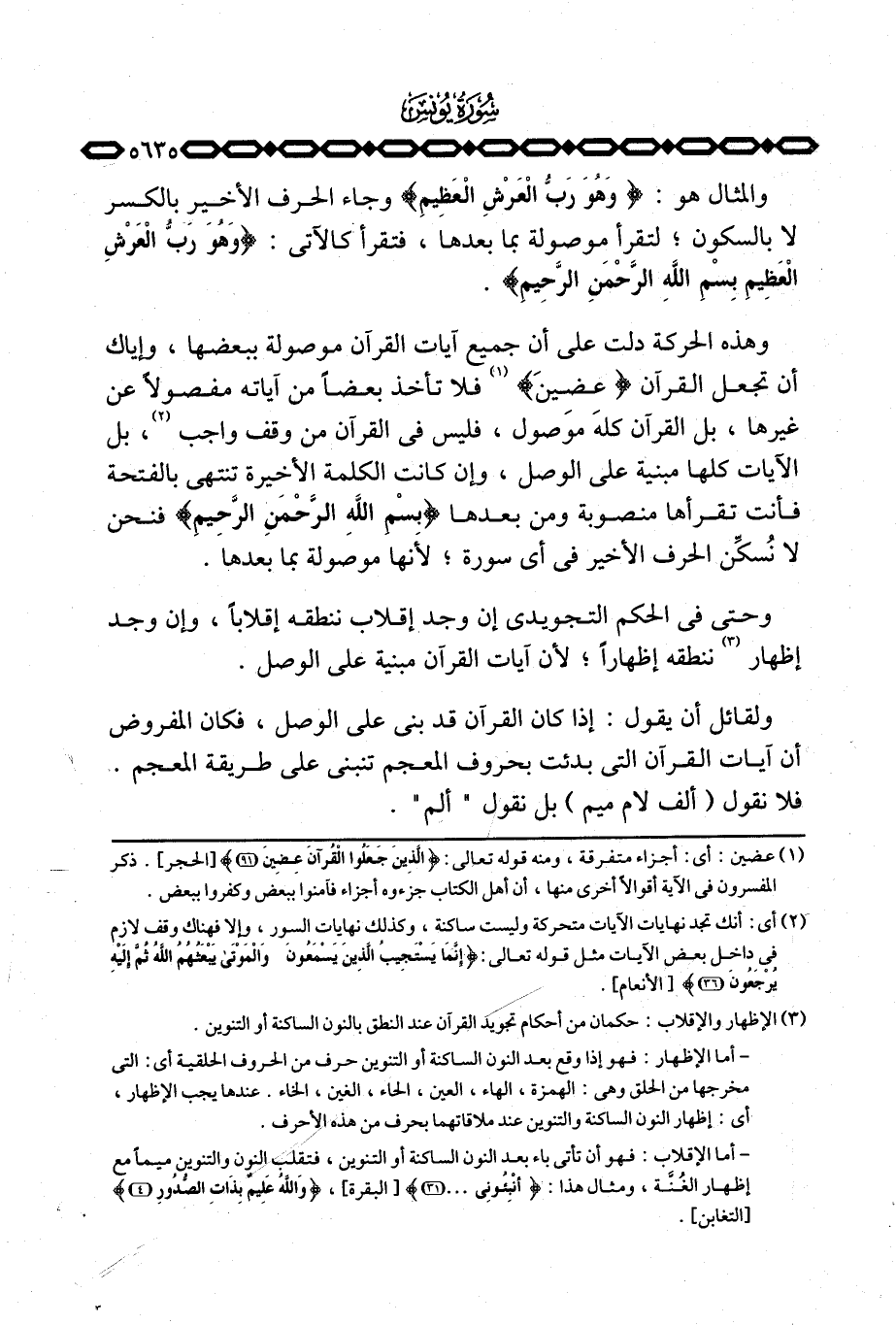 والمثال هو: {وَهُوَ رَبُّ العرش العظيم} وجاء الحرف الأخير بالكسر لا بالسكون؛ لتقرأ موصولة بما بعدها، فتقرأ كالآتي: {وَهُوَ رَبُّ العرش العظيم بسم الله الرحمن الرَّحِيمِ} .