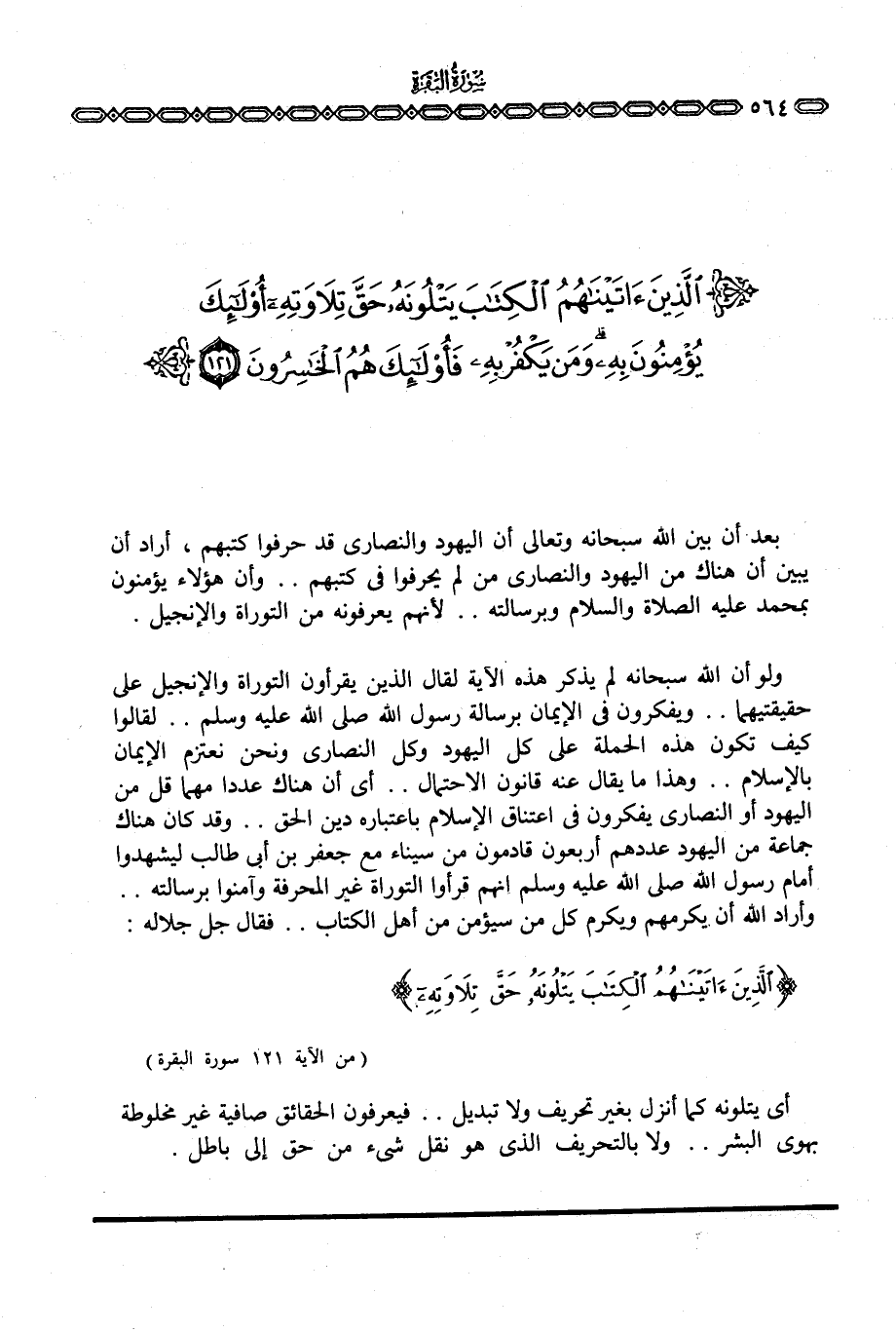 ولو أن الله سبحانه لم يذكر هذه الآية لقال الذين يقرأون التوراة والإنجيل على حقيقتيهما. . ويفكرون في الإيمان برسالة رسول الله صَلَّى اللَّهُ عَلَيْهِ وَسَلَّم َ. . لقالوا كيف تكون هذه الحملة على كل اليهود وكل النصارى ونحن نعتزم الإيمان بالإسلام. . وهذا ما يقال عنه قانون الاحتمال. . أي أن هناك عددا مهما قل من اليهود أو النصارى يفكرون في اعتناق الإسلام باعتباره دين الحق. . وقد كان هناك جماعة من اليهود عددهم أربعون قادمون من سيناء مع جعفر بن أبي طالب ليشهدوا أمام رسول الله صَلَّى اللَّهُ عَلَيْهِ وَسَلَّم َ أنهم قرأوا التوراة غير المحرفة وآمنوا برسالته. . وأراد الله أن يكرمهم ويكرم كل من سيؤمن من أهل الكتاب. . فقال جل جلاله: {الذين آتَيْنَاهُمُ الكتاب يَتْلُونَهُ حَقَّ تِلاَوَتِهِ} [البقرة: 121]