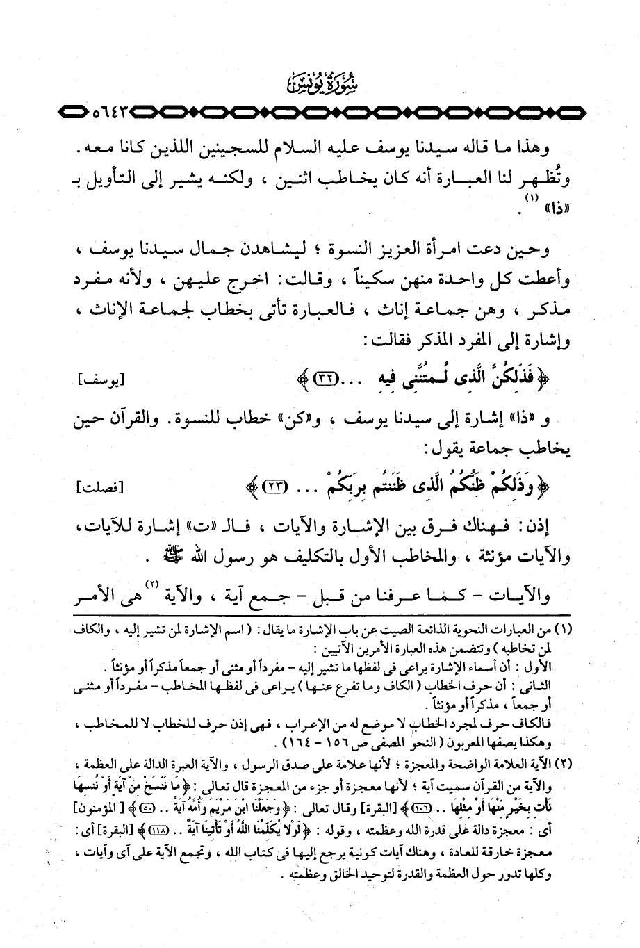 وحين دعت امرأة العزيز النسوة؛ ليشاهدن جمال سيدنا يوسف، وأعطت كل واحدة منهن سكيناً؛ وقالت: اخرج عليهن، ولأنه مفرد مذكر، وهن جماعة إناث، فالعبارة تأتي بخطاب لجماعة الإناث، وإشارة إلى المفرد المذكر فقالت: {فذلكن الذي لُمْتُنَّنِي ... } [يوسف: 32]
