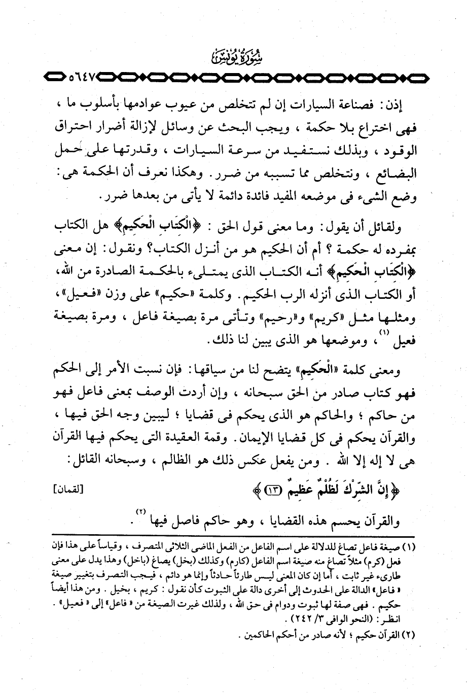 إذن: فصناعة السيارات إن لم تتخلص من عيوب عوادمها بأسلوب ما، فهي اختراع بلا حكمة، ويجب البحث عن وسائل لإزالة أضرار احتراق الوقود، وبذلك نستفيد من سرعة السيارات، وقدرتها على حمل البضائع، ونتخلص مما تسببه من ضرر. وهكذا نعرف أن الحكمة هي: وضع الشيء في موضعه المفيد فائدة دائمة لا يأتي من بعدها ضرر.