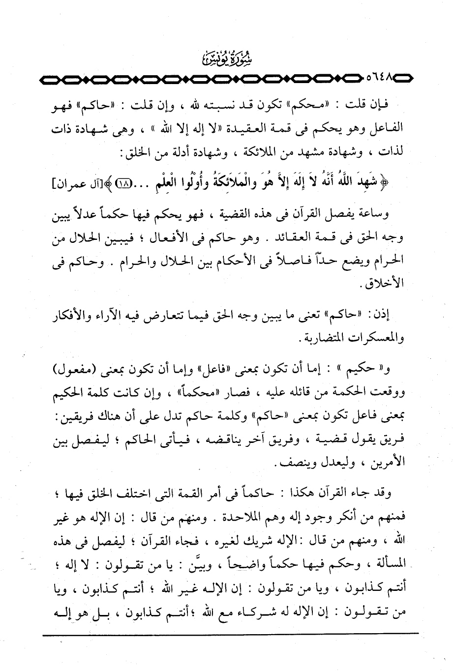 فإن قلت: «محكم» تكون قد نسبته لله، وإن قلت: «حاكم» فهو الفاعل وهو يحكم في قمة العقيدة «لا إله إلا الله» ، وهي شهادة ذات لذات، وشهادة مشهد من الملائكة، وشهادة أدلة من الخلق: {شَهِدَ الله أَنَّهُ لاَ إله إِلاَّ هُوَ والملائكة وَأُوْلُواْ العلم ... } [آل عمران: 18]