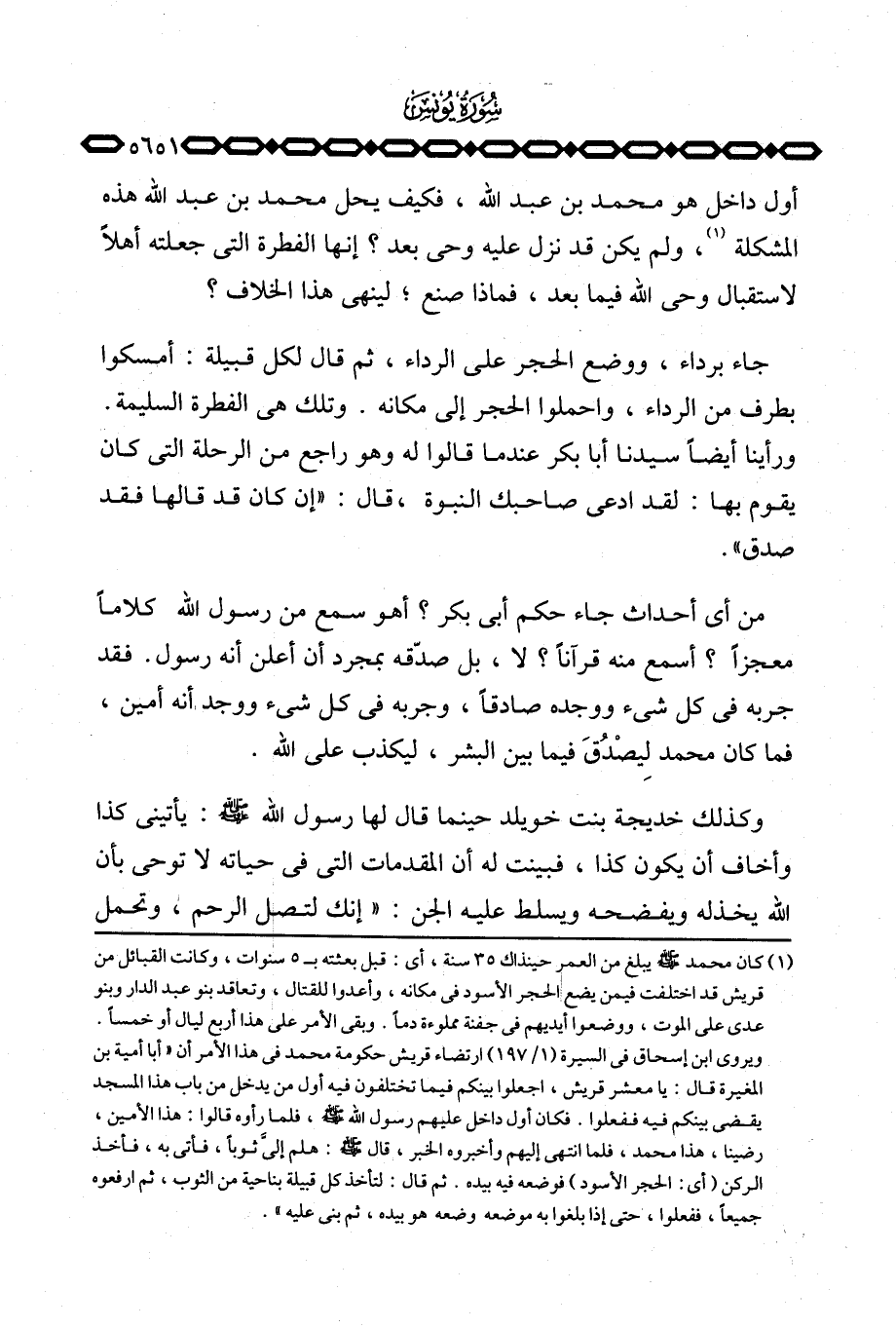 جاء برداء، ووضع الحجر على الرداء، ثم قال لكل قبيلة: أمسكوا بطرف من الرداء، واحملوا الحجر إلى مكانه. وتلك هي الفطرة السليمة. ورأينا أيضاً سيدنا أبا بكر عندما قالوا له وهو راجع من الرحلة التي كان يقوم بها: لقد ادعى صاحبك النبوة، قال: «إن كان قد قالها فقد صدق» .