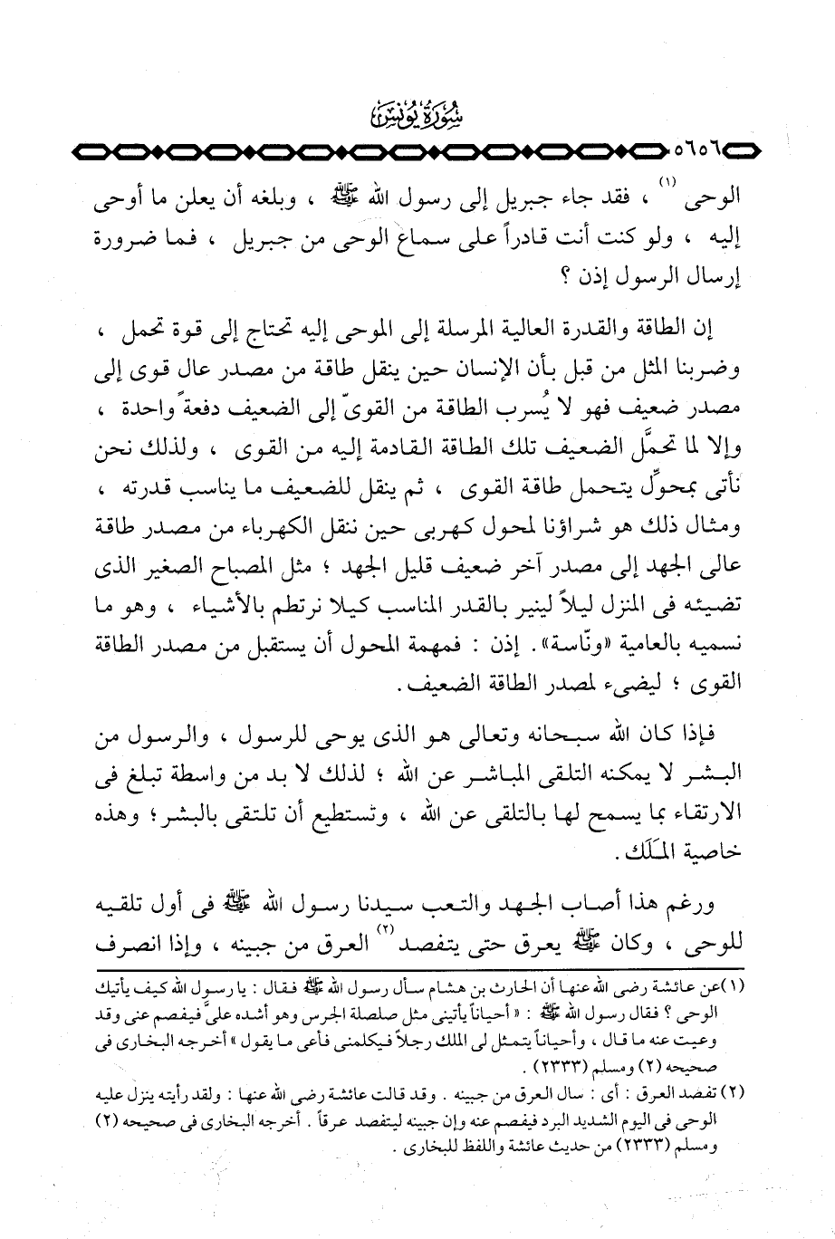 إن الطاقة والقدرة العالية المرسلة إلى الموحى إليه تحتاج إلى قوة تحمل، وضربنا المثل من قبل بأن الإنسان حين ينقل طاقة من مصدر عال قوى إلى مصدر ضعيف فهو لا يُسرب الطاقة من القويّ إلى الضعيف دفعةً واحدة، وإلا لما تحمَّل الضعيف تلك الطاقة من القادمة إليه من القوى، ولذلك نحن نأتي بمحوِّل يتحمل طاقة قوى، ثم ينقل للضعيف ما يناسب قدرته، ومثال ذلك هو شراؤنا لمحول كهربي حين ننقل الكهرباء من مصدر طاقة عالي الجهد إلى مصدر آخر ضعيف قليل الجهد؛ مثل المصباح الصغير الذي تضيئه في المنزل ليلاً لينير بالقدر المناسب كيلا نرتطم بالأشياء، وهو ما نسميه بالعامية «ونّاسة» . إذن: فمهمة المحول أن يستقبل من مصدر الطاقة القوي؛ ليضيء لمصدر الطاقة الضعيف.