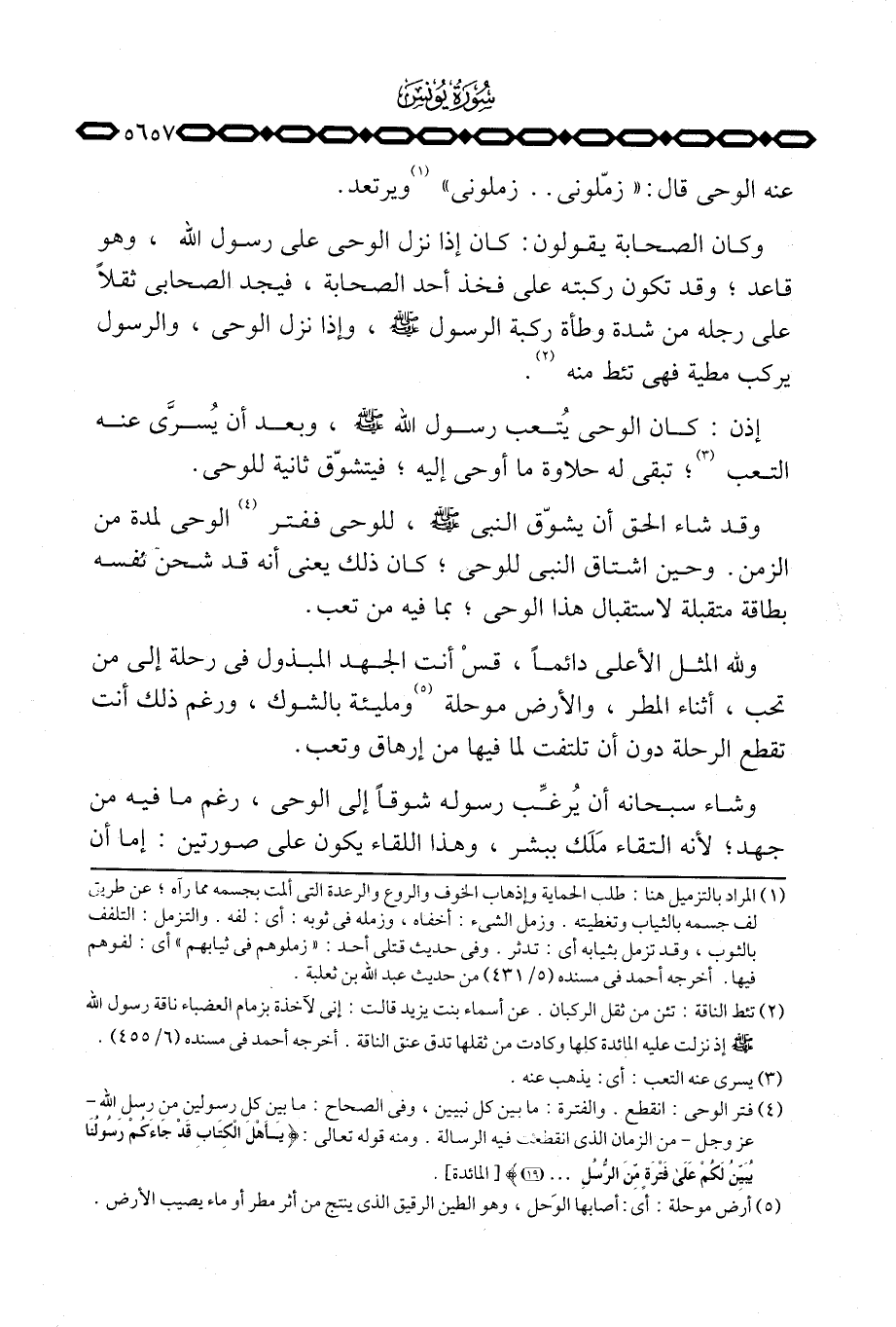 وكان الصحابة يقولون: كان إذا نزل الوحي على رسول على رسول الله، وهو قاعد؛ وقد تكون ركبته على فخذ أحد الصحابة، فيجد الصحابي ثقلاً على رجله من شدة وطأة ركبة الرسول صَلَّى اللَّهُ عَلَيْهِ وَسَلَّم َ، وإذا نزل الوحي، والرسول يركب مطيه فهي تئط منه.