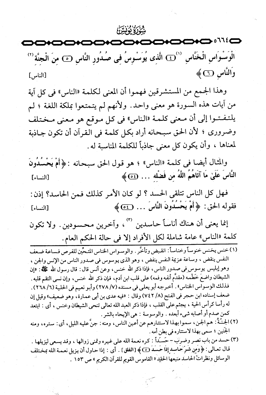 وهذا الجمع من المستشرقين فهموا أن المعنى لكلمة «الناس» في كل آية من آيات هذه السورة هو معنى واحد. ولنهم لم يتمتعوا بملكة اللغة؛ لم يلتفتوا إلى أن معنى كلمة «الناس» في كل موقع هو معنى مختلف وضروري؛ لأن الحق سبحانه أراد بكل كلمة في القرآن أن تكون جائبة لمعناها، وأن يكون كل معنى جاذباً للكلمة المناسبة له.