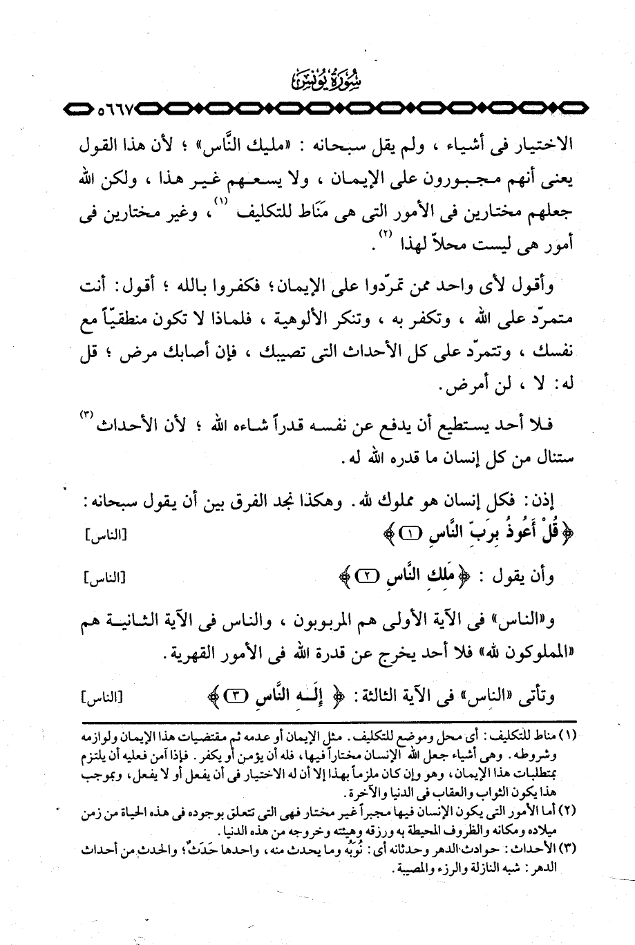 و «الناس» في الآية الأولى هم المربون، والناس في الآية الثانية هم «المملوكون لله» فلا أحد يخرج عن قدرة الله في الأمور القهرية.