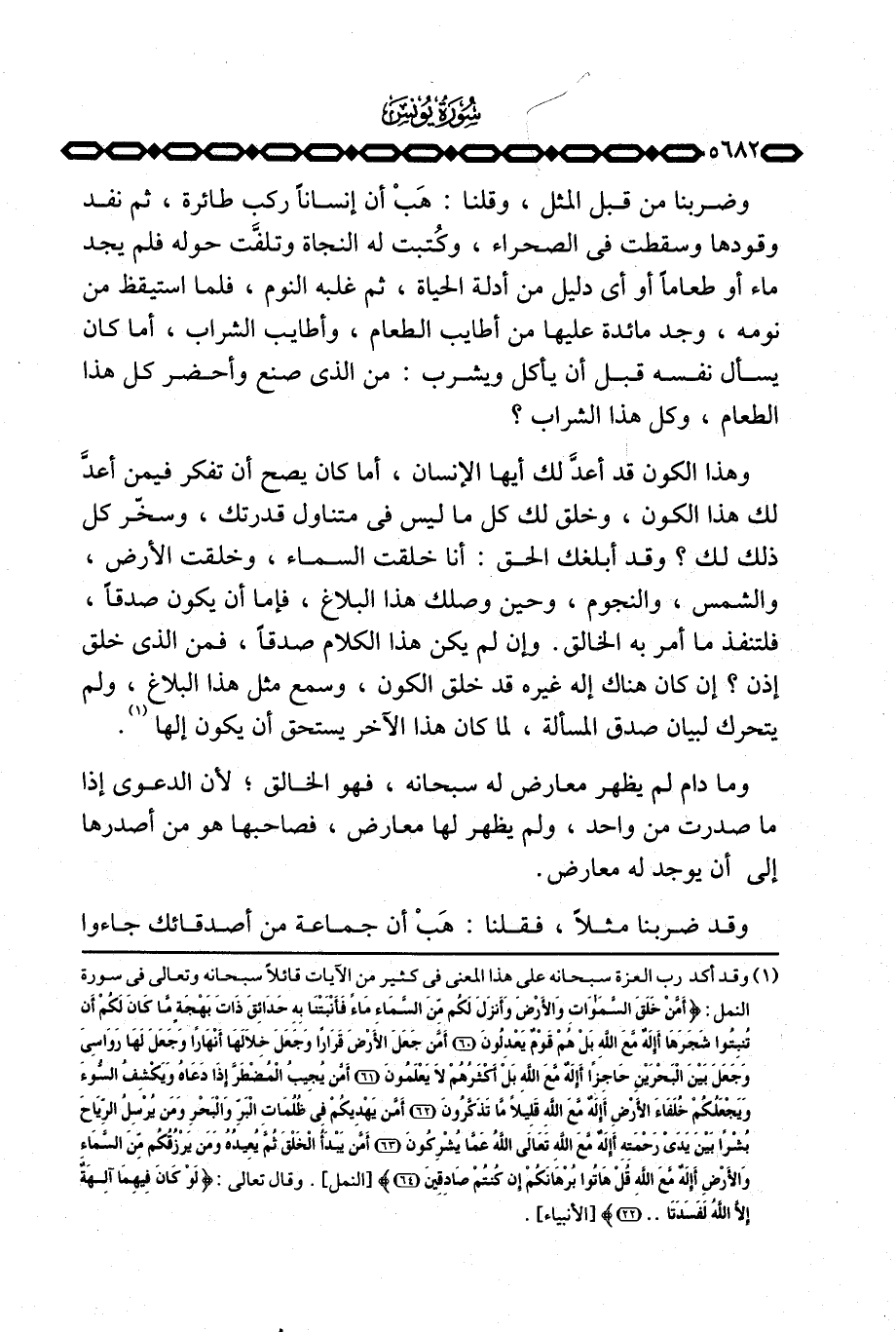 وضربنا من قبل المثل، وقلنا: هَبْ أن إنساناً ركب طائرة، ثم نفد وقودها وسقطت في الصحراء، وكُتبت له النجاة وتلفَّت حوله فلم يجد ماء أو طعاماً أو أي دليل من أدلة الحياة، ثم غلبه النوم، فلما استيقظ من نومه، وجد مائدة عليها من أطايب الطعام، وأطايب الشراب، أما كان يسأل نفسه قبل أن يأكل ويشرب: من الذي صنع وأحضر كل هذا الطعام، وكل هذا الشراب؟