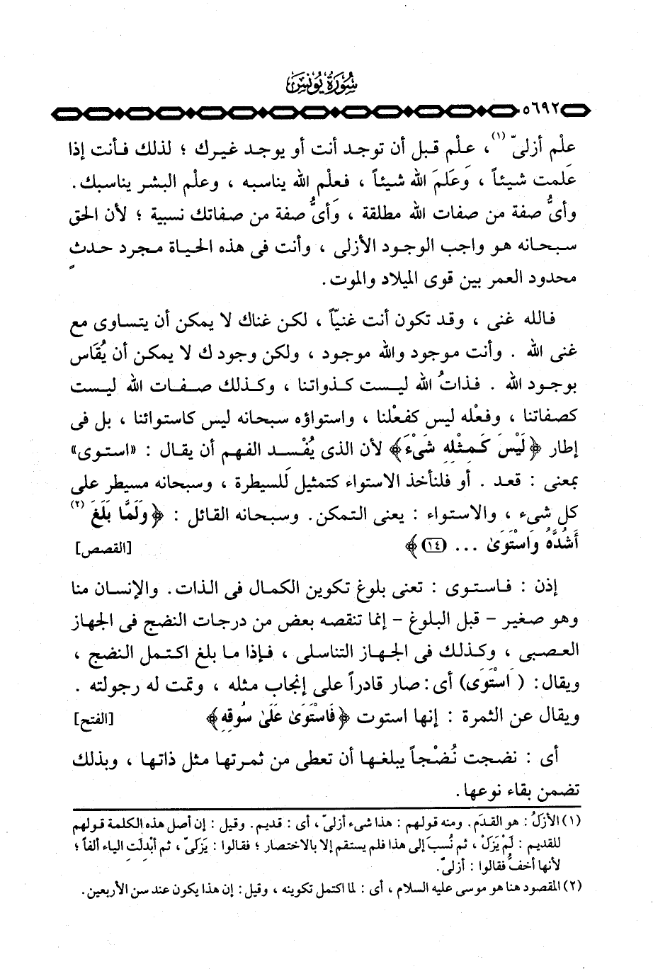 فالله غني، وقد تكون أنت غنيّاً، لكن غناك لا يمكن أن يتساوى مع غنى الله. وأنت موجود والله موجود، ولكن وجودك لا يمكن أن يُقَاس بوجود الله. فذاتُ الله ليست كذواتنا، وكذلك صفات الله ليست كصفاتنا، وفعْله ليس كفعْلنا، واستواؤه سبحانه ليس كاستوائنا، بل في إطار {لَيْسَ كَمِثْلِهِ شَيْءٌ} لأن الذي يُفْسد الفهم أن يقال: «استوى» بمعنى: قعد. أو فلنأخذ الاستواء كتمثيل للسيطرة، وسبحانه مسيطر على كل شيء، والاستواء: يعني التمكن. وسبحانه القائل: {وَلَمَّا بَلَغَ أَشُدَّهُ واستوى ... } [القصص: 14]