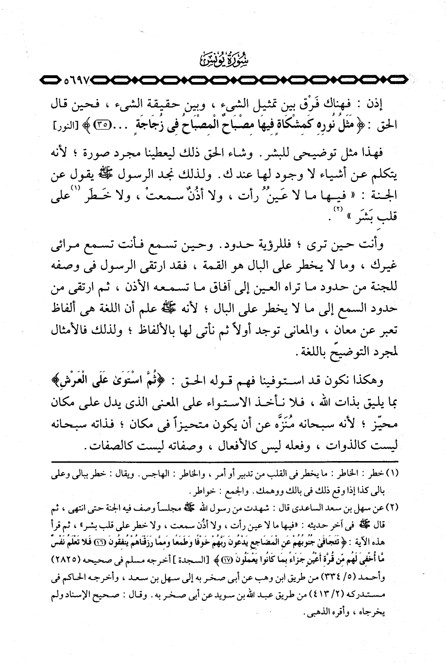وأنت حين ترى؛ فللرؤية حدود. وحين تسمع فأنت تسمع مرائي غيرك، وما لا يخطر على البال هو القمة، فقد ارتقى الرسول في وصفه للجنة من حدود ما تراه العين إلى آفاق ما تسمعه الأذن، ثم ارتقى من حدود السمع إلى ما لا يخطر على البال؛ لأنه صَلَّى اللَّهُ عَلَيْهِ وَسَلَّم َ علم أن اللغة هي ألفاظ تعبر عن معان، والمعاني تزجد أولاً ثم نأتي لها بالألفاظ؛ ولذلك فالأمثال لمجرد التوضيح باللغة.