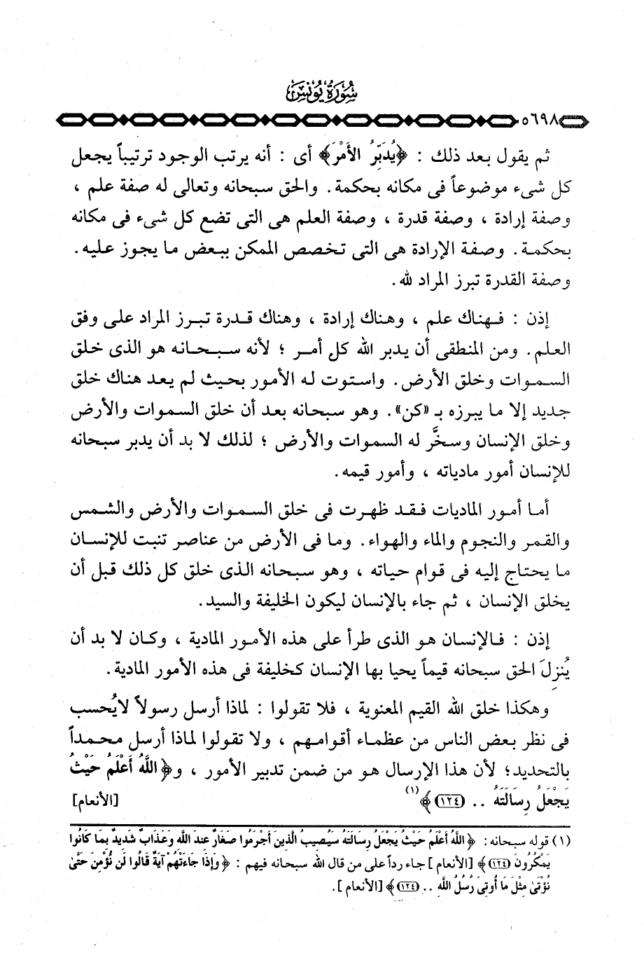 إذن: فهناك علم، وهناك إرادة، وهناك قدرة تبرز المراد على وفق العلم. ومن المنطقي أن يدبر الله كل أمر؛ لأنه سبحانه هو الذي خلق السموات وخلق الأرض. واستوت له الأمور بحيث لم يعد هناك خلق جديد إلا ما يبرزه ب «كن» . وهو سبحانه بعد أن خلق السموات والأرض وخلق الإنسان وسخَّر له السموات والأرض؛ لذلك لا بد أن يدبر سبحانه للإنسان أمور مادياته، وأمور قيمه.