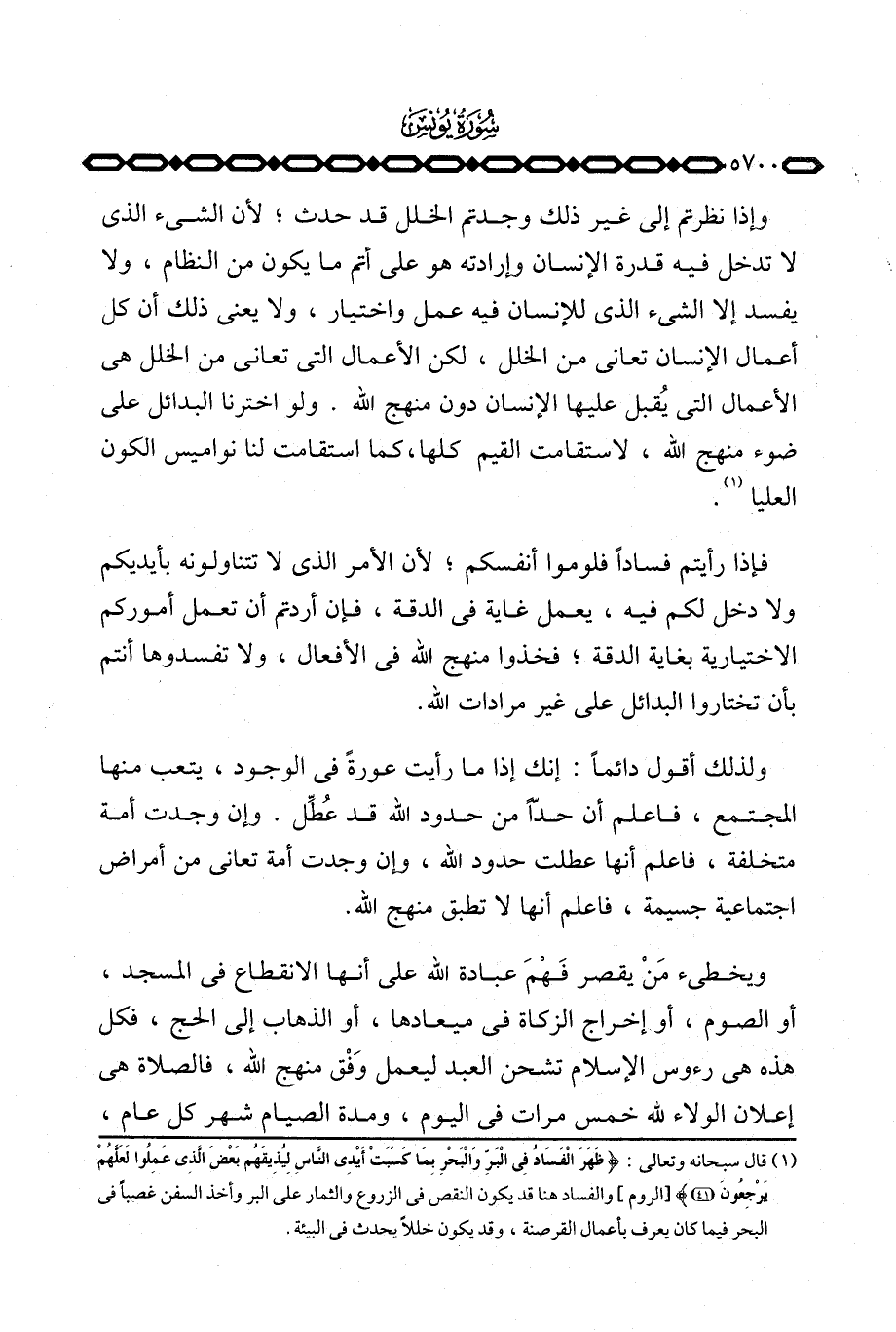 ولذلك أقول دائماً: إنك إذا ما رأيت عورةً في الوجود، يتعب منها المجتمع، فاعلم أن حدّاً من حدود الله قد عُطِّل. وإن وجدت أمة متخلفة، فاعلم أنها عطلت حدود الله، وإن وجدت أمة تعاني من أمراض اجتماعية جسيمة، فاعلم أنها لا تطبق منهج الله.