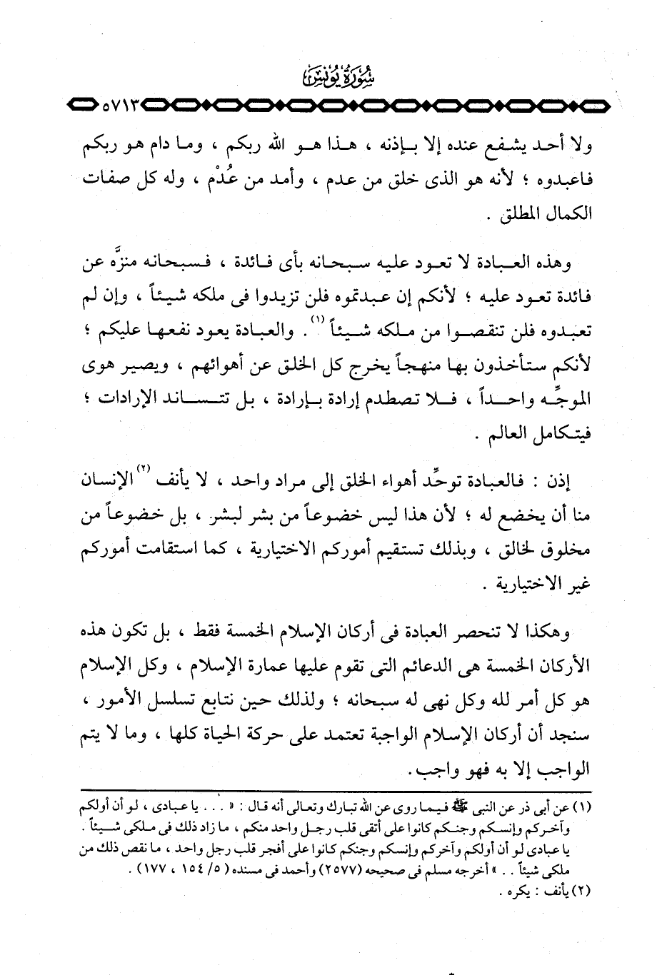 وهكذا لا تنحصر العبادة في أركان الإسلام الخمسة فقط، بل تكون هذه الأركان الخمسة هي الدعائم التي تقوم عليها عمارة الإسلام، وكل الإسلام هو كل أمر لله وكل نهي له سبحانه؛ ولذلك حين نتابع تسلسل الأمور، سنجد أن أركان الإسلام الواجبة تعتمد على حركة الحياة كلها، وما لا يتم الواجب إلا به فهو واجب.
