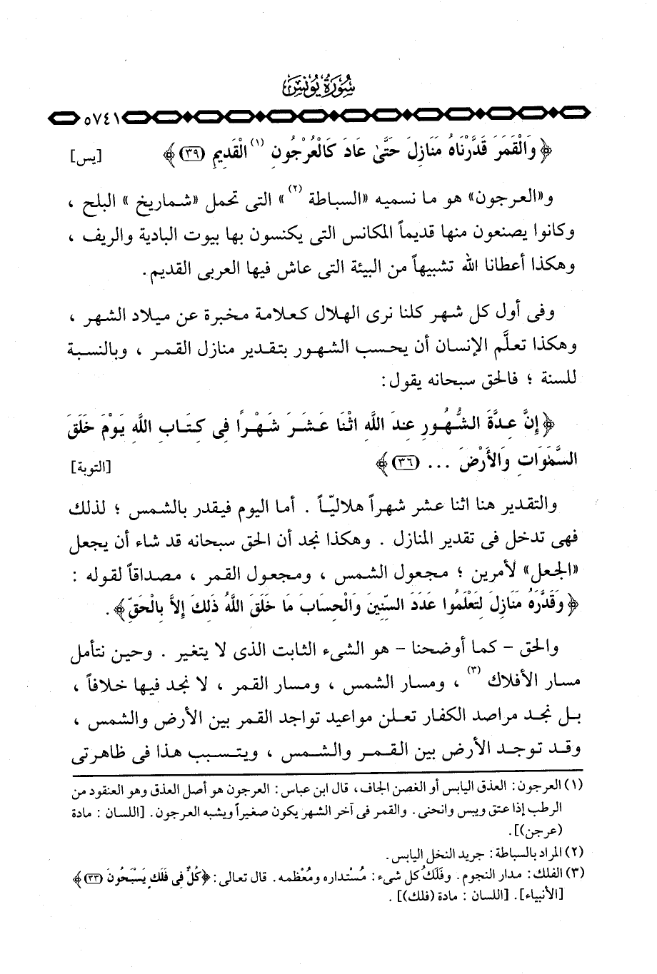 و «العرجون» هو ما نسميه «السباطة» التي تحمل «شماريخ» البلح، وكانوا يصنعون منها قديماً المكانس التي يكنسون بها بيوت البادية والريف، وهكذا أعطانا الله تشبيهاً من البيئة التي عاش فيها العربي القديم.