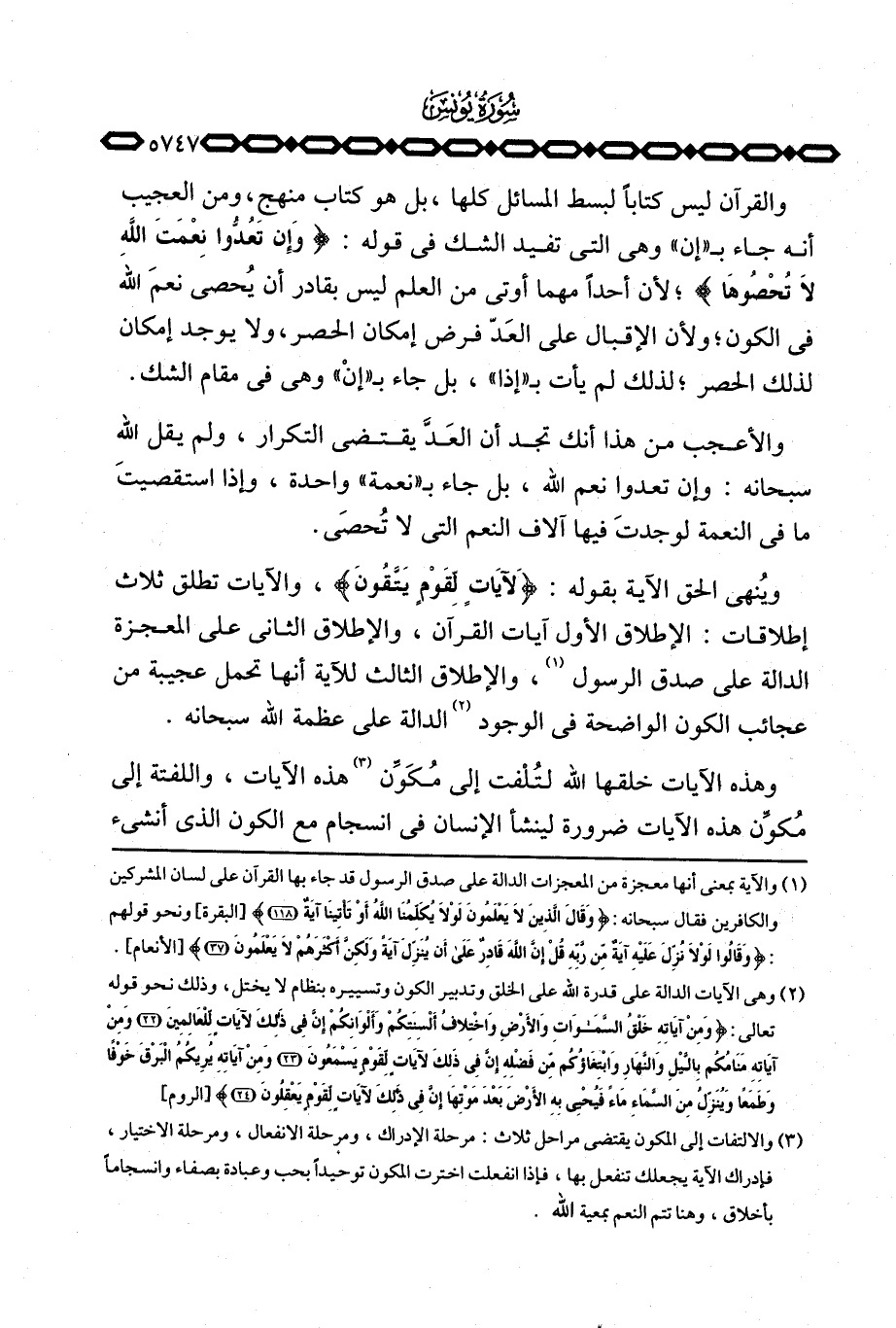 والقرآن ليس كتاباً لبسط المسائل كلها، بل هو كتاب منهج، ومن العجيب أنه جاء ب «إن» وهي التي تفيد الشك في قوله: {وَإِن تَعُدُّواْ نِعْمَتَ الله لاَ تُحْصُوهَا} ؛ لأن أحداً مهما أوتي من العلم ليس بقادر أن يُحصي نعمَ الله في الكون؛ ولأن الإقبال على العَدّ فرض إمكان الحصر، ولا يوجد إمكان لذلك الحصر؛ لذلك لم يأت ب «إذا» ، بل جاء ب «إنْ» وهي في مقام الشك.