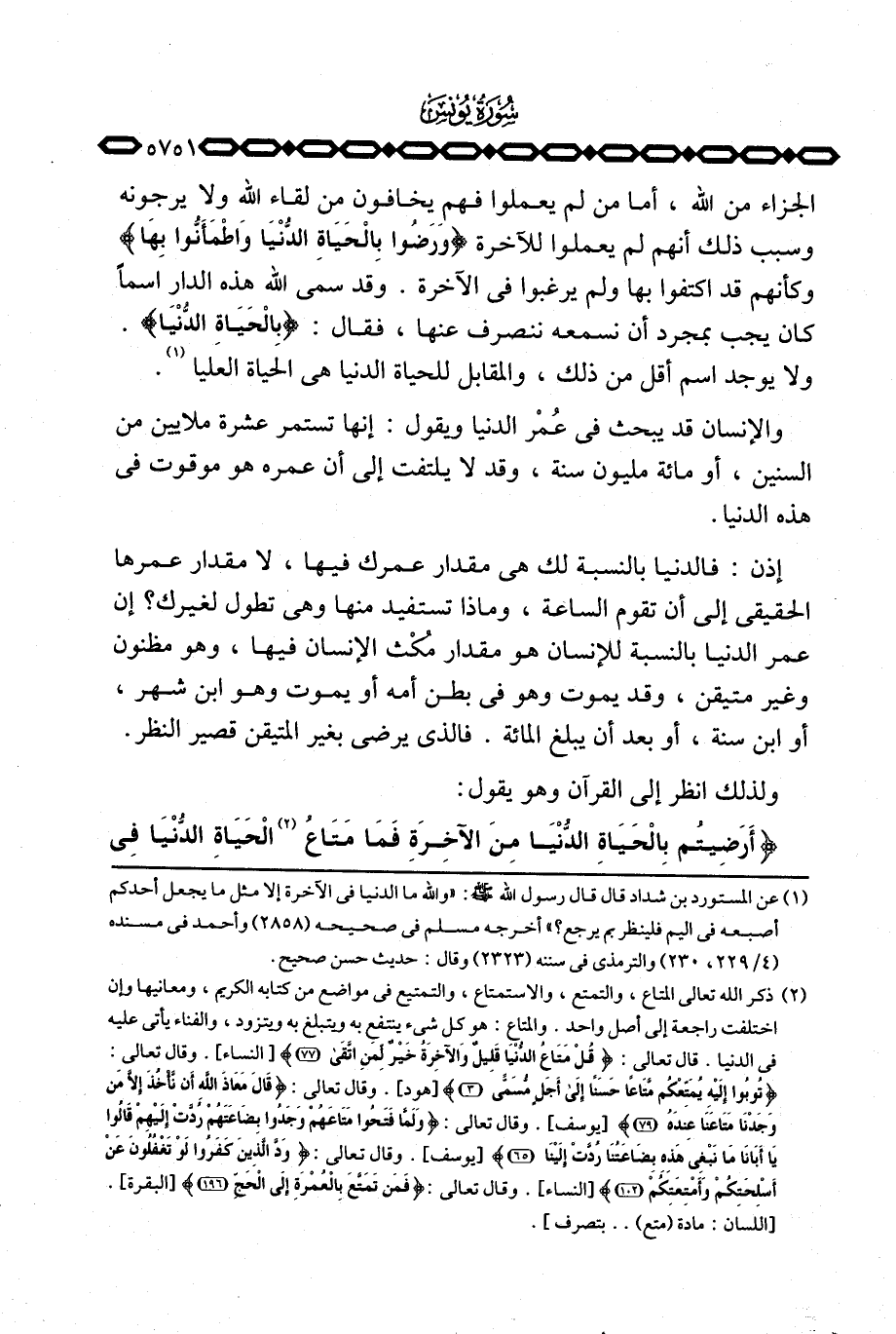ولذلك انظر إلى القرآن وهو يقول: {أَرَضِيتُمْ بالحياوة الدنيا مِنَ الآخرة فَمَا مَتَاعُ الحياوة الدنيا فِي الآخرة إِلاَّ قَلِيلٌ} [التوبة: 38] .