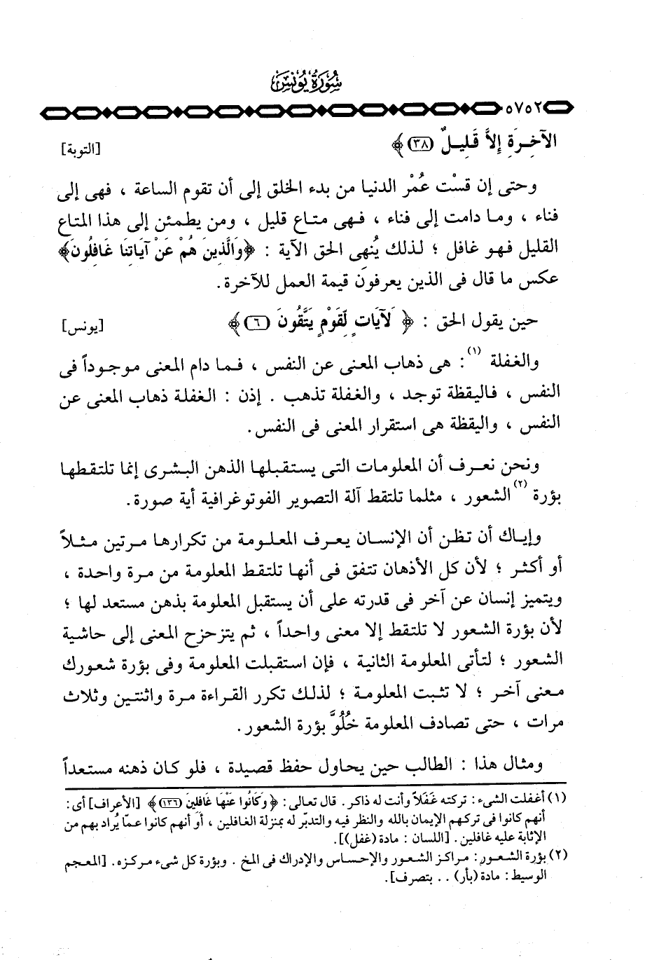 وإياك أن تظن أن الإنسان يعرف المعلومة من تكرارها مرتين مثلاً أو أكثر؛ لأن كل الأذهان تتفق في أنها تلتقط المعلومة من مرة واحدة، ويتميز إنسان عن آخر في قدرته على أن يستقبل المعلومة بذهن مستعد لها؛ لأن بورة الشعور لا تلتقط إلا معنى واحداً، ثم يتزحزح المعنى إلى حاشية الشعور؛ لتأتي المعلومة الثانية، فإن استقبلت المعلومة وفي بؤرة شعورك معنى آخر؛ لا تثبت المعلومة؛ لذلك تكرر القراءة مرة واثنتين وثلاث مرات، حتى تصادف المعلومة خُلُوَّ بؤرة الشعور.