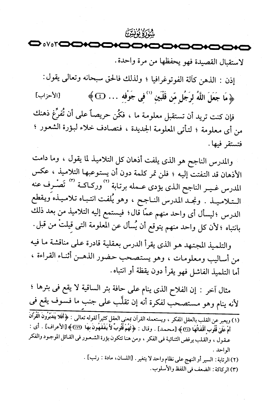 والتلميذ المجتهد هو الذي يقرأ الدرس بعقلية قادرة على مناقشة ما فيه من أساليب ومعلومات، وهو يستصحب حضور الذهن أثناء القراءة، أما التلميذ الفاشل فهو يقرأ دون يقظة أو انتباه.