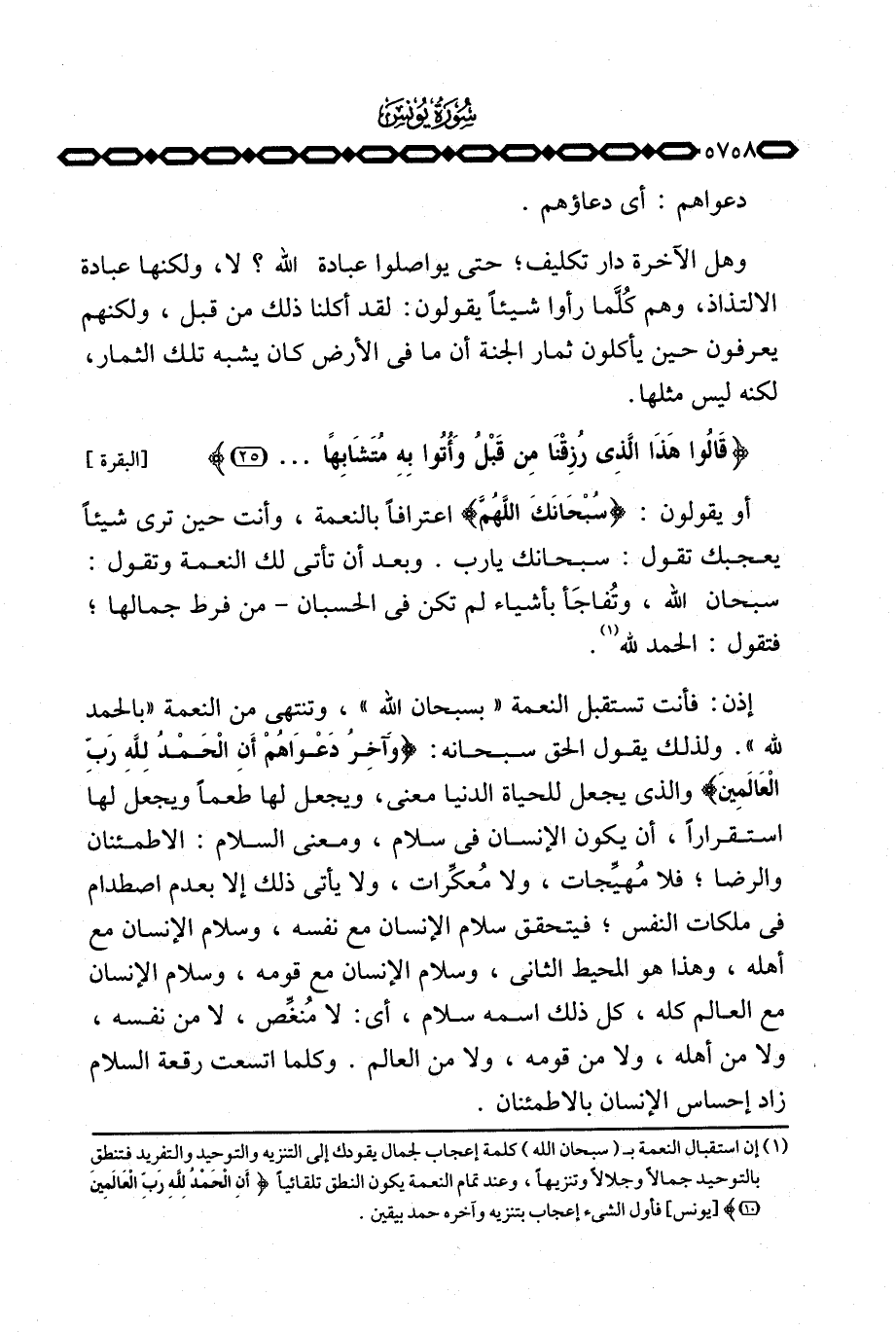 إذن: فأنت تستقبل النعمة «بسبحان الله» ، وينتهي من النعمة «بالحمد لله» . ولذلك يقول الحق سبحانه: {وَآخِرُ دَعْوَاهُمْ أَنِ الحمد للَّهِ رَبِّ العالمين} والذي يجعل للحياة الدنيا معنى، ويجعل لها طعماً ويجعل لها استقراراً، أن يكون الإنسان في سلام، ومعنى السلام: الاطمئنان والرضا؛ فلا مُهيِّجات، ولا مُعكِّرات، ولا يأتي ذلك إلا بعدم اصطدام في ملكات النفس؛ فيتحقق سلام الإنسان مع نفسه، وسلام الإنسان مع أهله، وهذا هو المحيط الثاني، وسلام الإنسان مع قومه، وسلام الإنسان مع العالم كله، كل ذلك اسمه سلام، لا مُنغِّص، لا من نفسه، ولا من أهله، ولا من قومه، ولا من العالم. وكلما اتسعت رقعة السلام زاد الإحساس الإنسان بالاطمئنان.