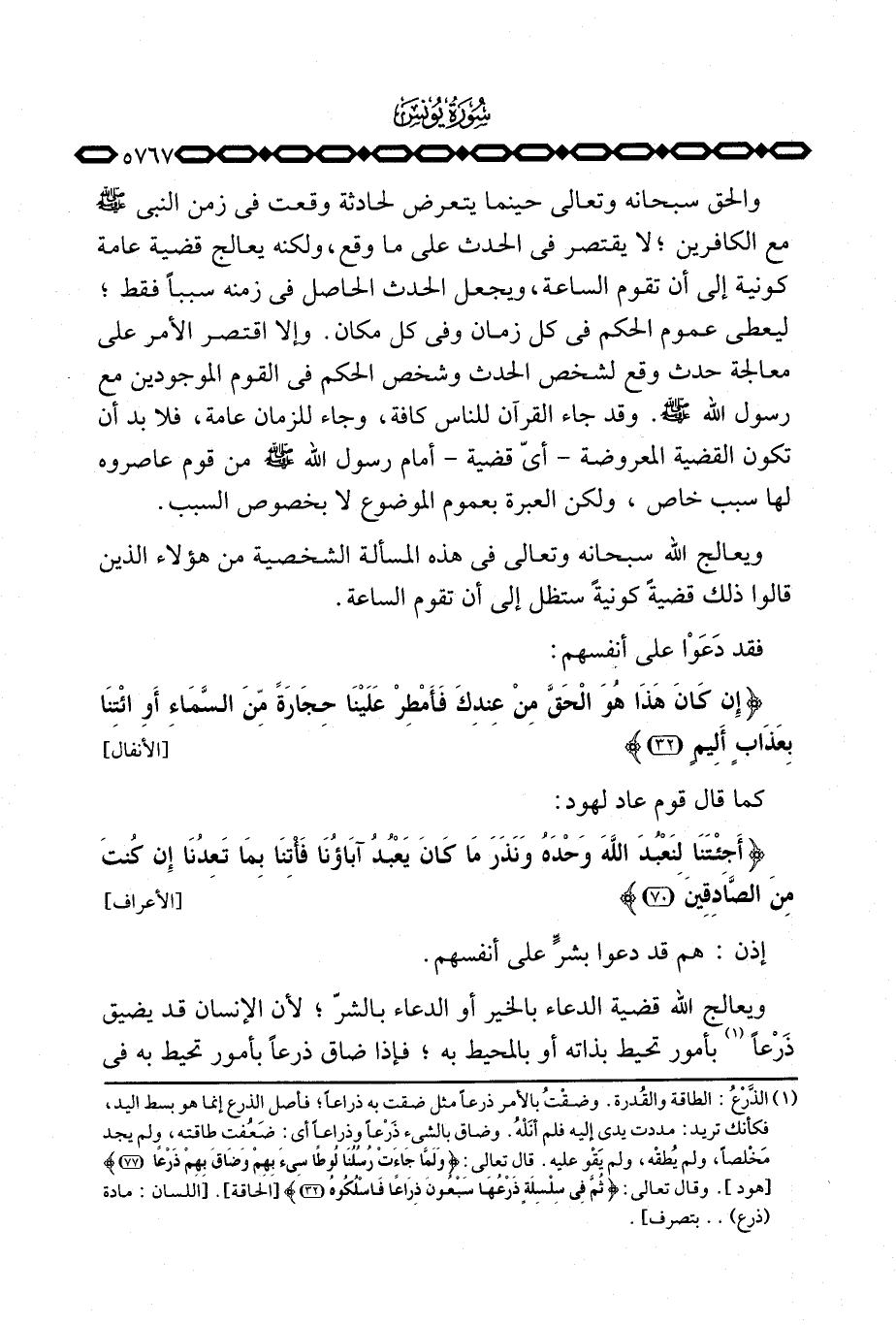 والحق سبحانه وتعالى حينما يتعرض لحادثة وقعت في زمن النبي صَلَّى اللَّهُ عَلَيْهِ وَسَلَّم َ مع الكافرين؛ لا يقتصر في الحدث على ما وقع، ولكنه يعالج قضية عامة كونية إلى أن تقوم الساعة، ويجعل الحدث الحاصل في زمنه سبباً فقط؛ ليعطي عموم الحكم في كل زمان وفي كل مكان. وإلا اقتصر الأمر على رسول الله صَلَّى اللَّهُ عَلَيْهِ وَسَلَّم َ. وقد جاء القرآن للناس كافة، وجاء للزمان عامة، فلا بد أن تكون القضية المعروضة - أيّ قضية - أمام رسول الله صَلَّى اللَّهُ عَلَيْهِ وَسَلَّم َ من قوم عاصروه لها سبب خاص، ولكن العبرة بعموم الموضوع لا بخصوص السبب.