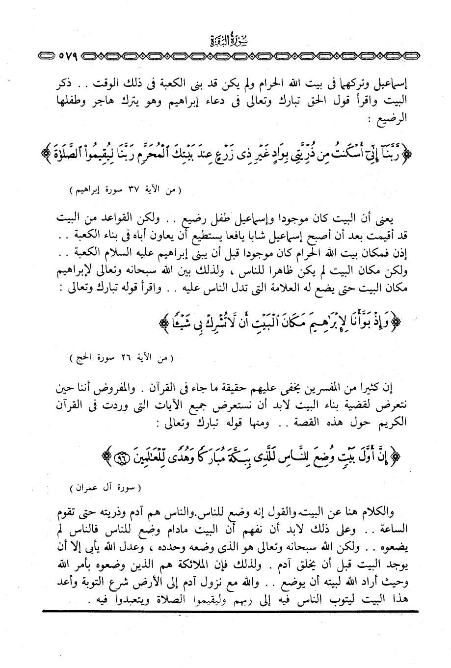 إسماعيل وتركهما في بيت الله الحرام ولم يكن قد بنى الكعبة في ذلك الوقت. . ذكر البيت واقرأ قول الحق تبارك وتعالى في دعاء إبراهيم وهو يترك هاجر وطفلها الرضيع: {رَّبَّنَآ إني أَسْكَنتُ مِن ذُرِّيَّتِي بِوَادٍ غَيْرِ ذِي زَرْعٍ عِندَ بَيْتِكَ المحرم رَبَّنَا لِيُقِيمُواْ الصلاة} [إبراهيم: 37]