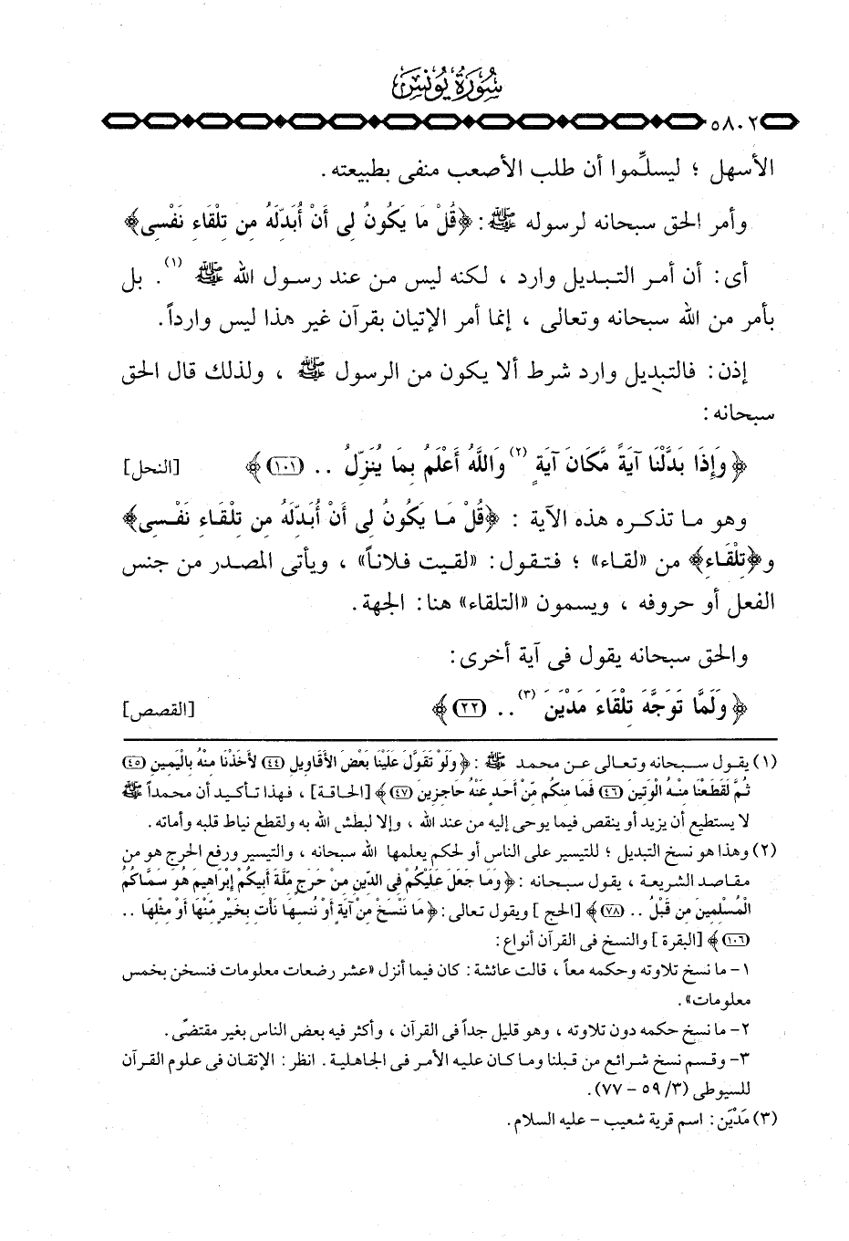 {وَإِذَا بَدَّلْنَآ آيَةً مَّكَانَ آيَةٍ والله أَعْلَمُ بِمَا يُنَزِّلُ} [النحل: 101] وهو ما تذكره هذه الآية: {قُلْ مَا يَكُونُ لي أَنْ أُبَدِّلَهُ مِن تِلْقَآءِ نفسي} و {تِلْقَآءِ} من «لقاء» ؛ فتقول: «لقيت فلاناً» ، ويأتي المصدر من جنس الفعل أو حروفه، ويسمون «التلقاء» هنا: الجهة.