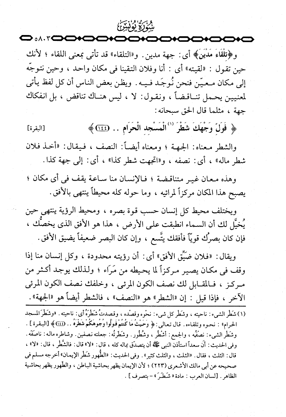 ويقال: «فلان ضَيِّق الأفق» أي: أن رؤيته محدودة، وكل إنسان منا إذا وقف في مكان يصير مركزاً لما يحيطه من مَرَاء؛ ولذلك يوجد أكثر من مركز، فالمقابل لك نصف الكون المرئي، وخلفك نصف الكون المرئي الآخر، فإذا قيل: إن «الشطر» هو «النصف» ، فالشطر أيضاً هو «الجهة» .