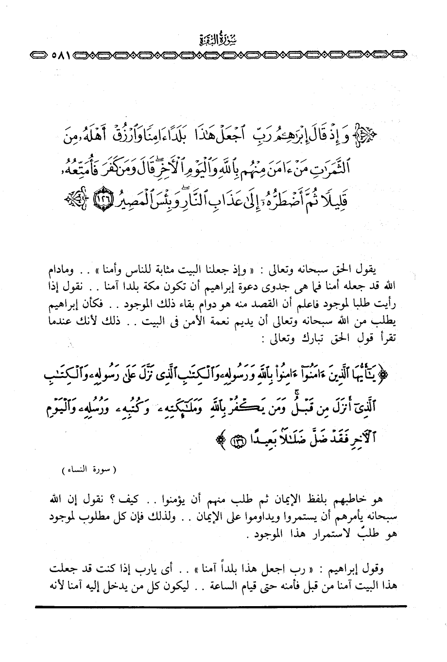 يقول الحق سبحانه وتعالى: {وَإِذْ جَعَلْنَا البيت مَثَابَةً لِّلنَّاسِ وَأَمْناً} . . ومادام الله قد جعله أمنا فما هي جدوى دعوة إبراهيم أن تكون مكة بلدا آمنا. . نقول إذا رأيت طلبا لموجود فاعلم أن القصد منه هو دوام بقاء ذلك الموجود. . فكأن إبراهيم يطلب من الله سبحانه وتعالى أن يديم نعمة الأمن في البيت. . ذلك لأنك عندما تقرأ قول الحق تبارك وتعالى: {يَا أَيُّهَا الذين آمَنُواْ آمِنُواْ بالله وَرَسُولِهِ والكتاب الذي نَزَّلَ على رَسُولِهِ والكتاب الذي أَنزَلَ مِن قَبْلُ وَمَن يَكْفُرْ بالله وَمَلآئِكَتِهِ وَكُتُبِهِ وَرُسُلِهِ واليوم الآخر فَقَدْ ضَلَّ ضَلاَلاً بَعِيداً} [النساء: 136]