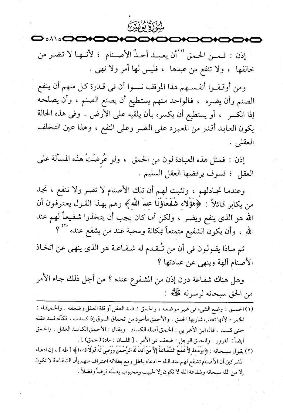 وعندما تجادلهم، وتثبت لهم أن تلك الأصنام لا تضر ولا تنفع، تجد من يكابر قائلاً: {هؤلاء شُفَعَاؤُنَا عِندَ الله} وهم بهذا القول يعترفون أن الله هو الذي ينفع ويضر، ولكن أما كان يجب أن يتخذوا شفيعاً لهم عند الله، وأن يكون الشفيع متمتعاً بمكانة ومحبة عند من يشفع عنده؟